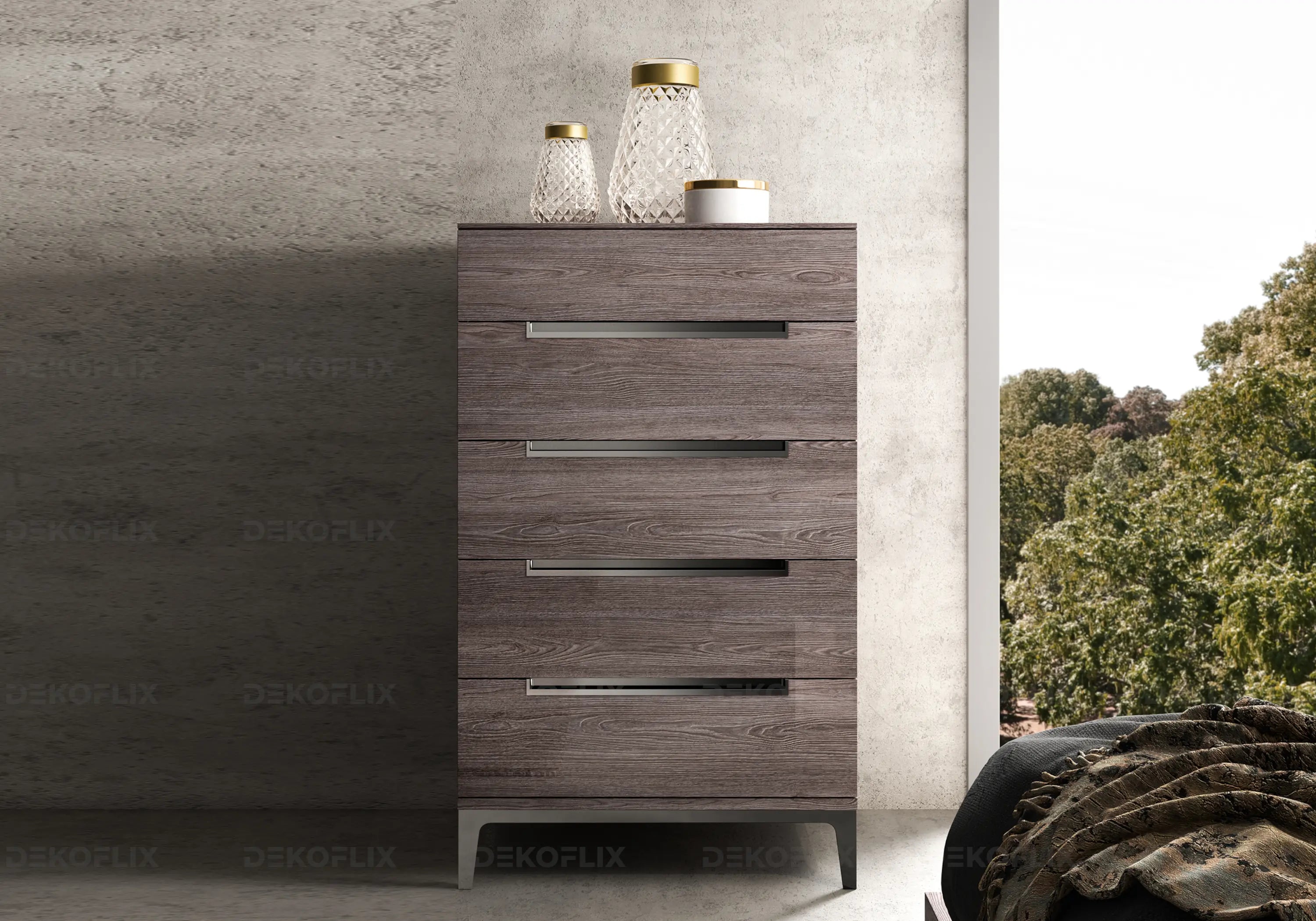 Chiffonnier : Avec ses 5 tiroirs verticaux, il optimise le rangement dans un espace réduit, tout en gardant le style typique de la collection .