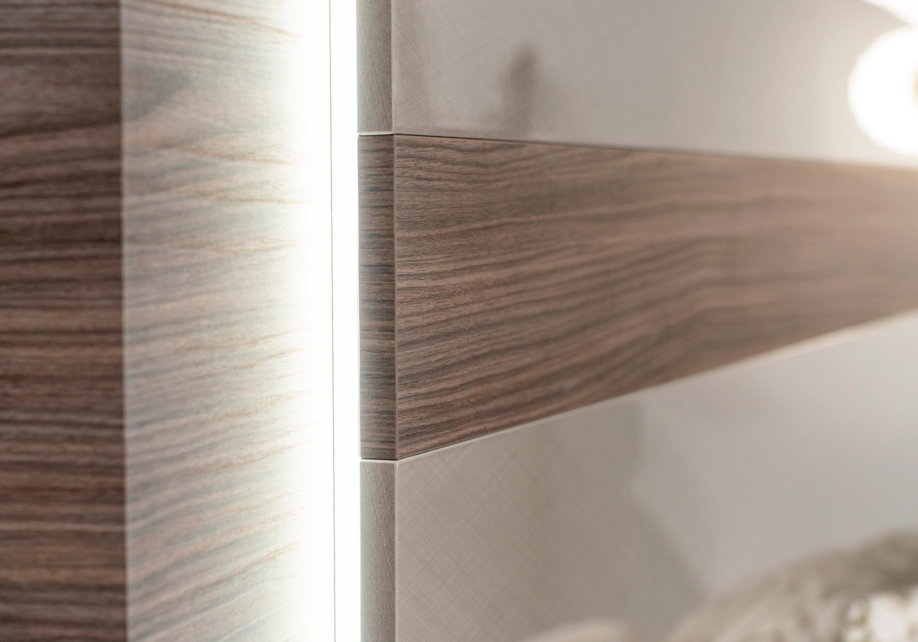 Lit design LED, armoires coordonnées, ambiance bois chic moderne.
