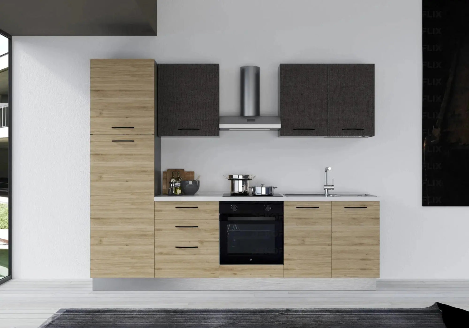 ✔ Détails noirs mats : poignées, pieds, contraste raffiné