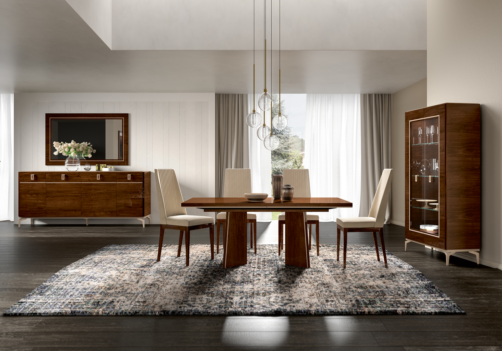 Avec ses proportions généreuses, le buffet 4 portes Eva structure élégamment une salle à manger contemporaine. Sa finition laquée noyer brillante révèle la profondeur du décor bois, soulignée par un bandeau doré signature.