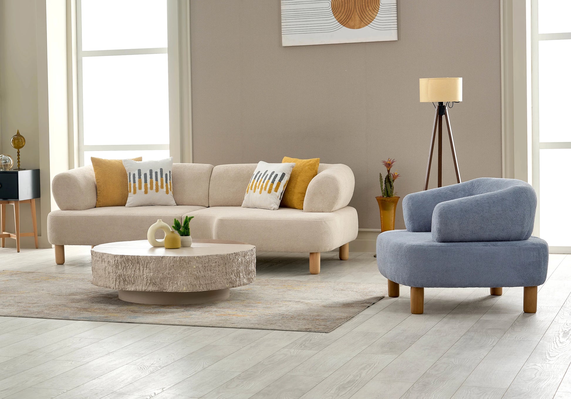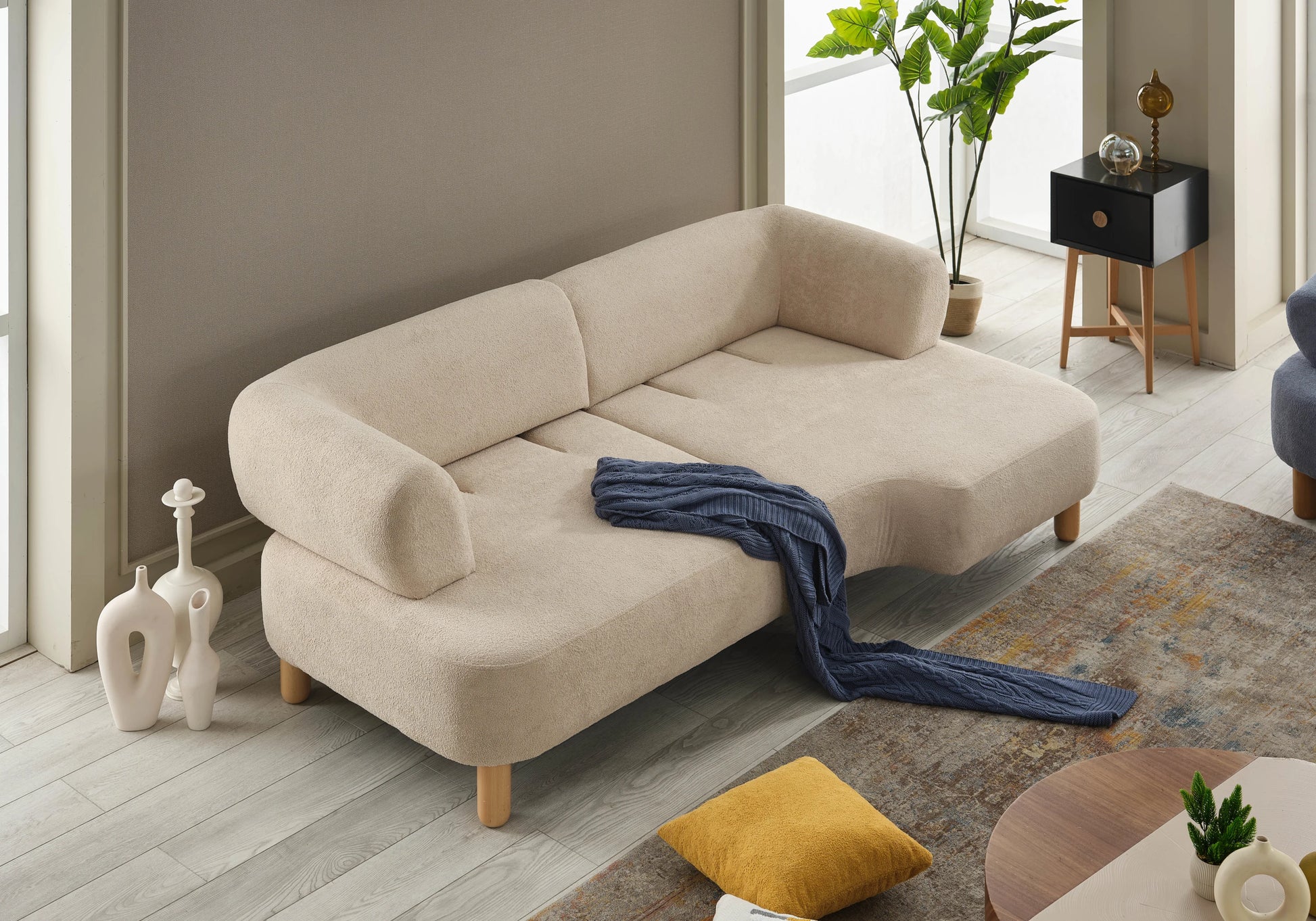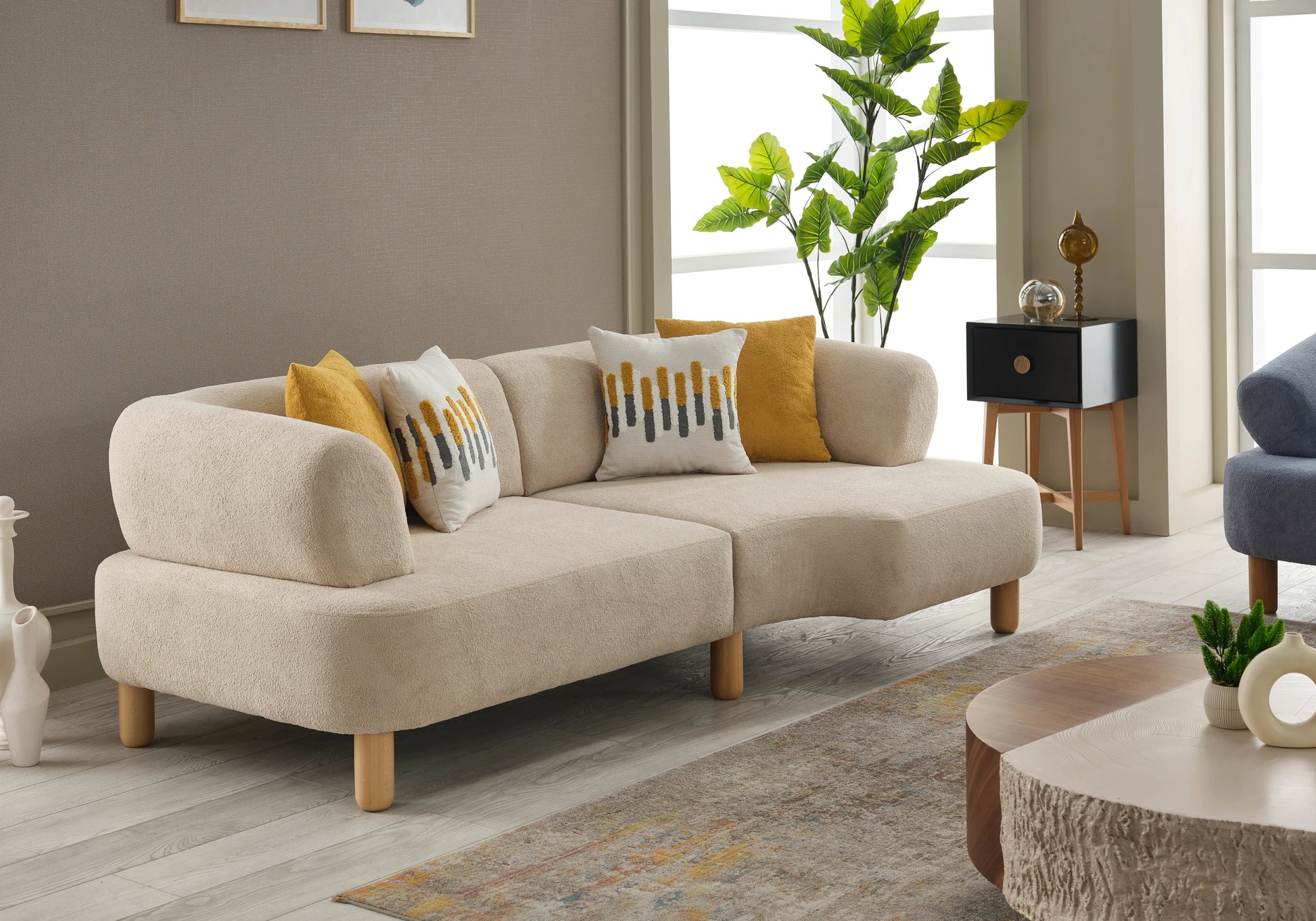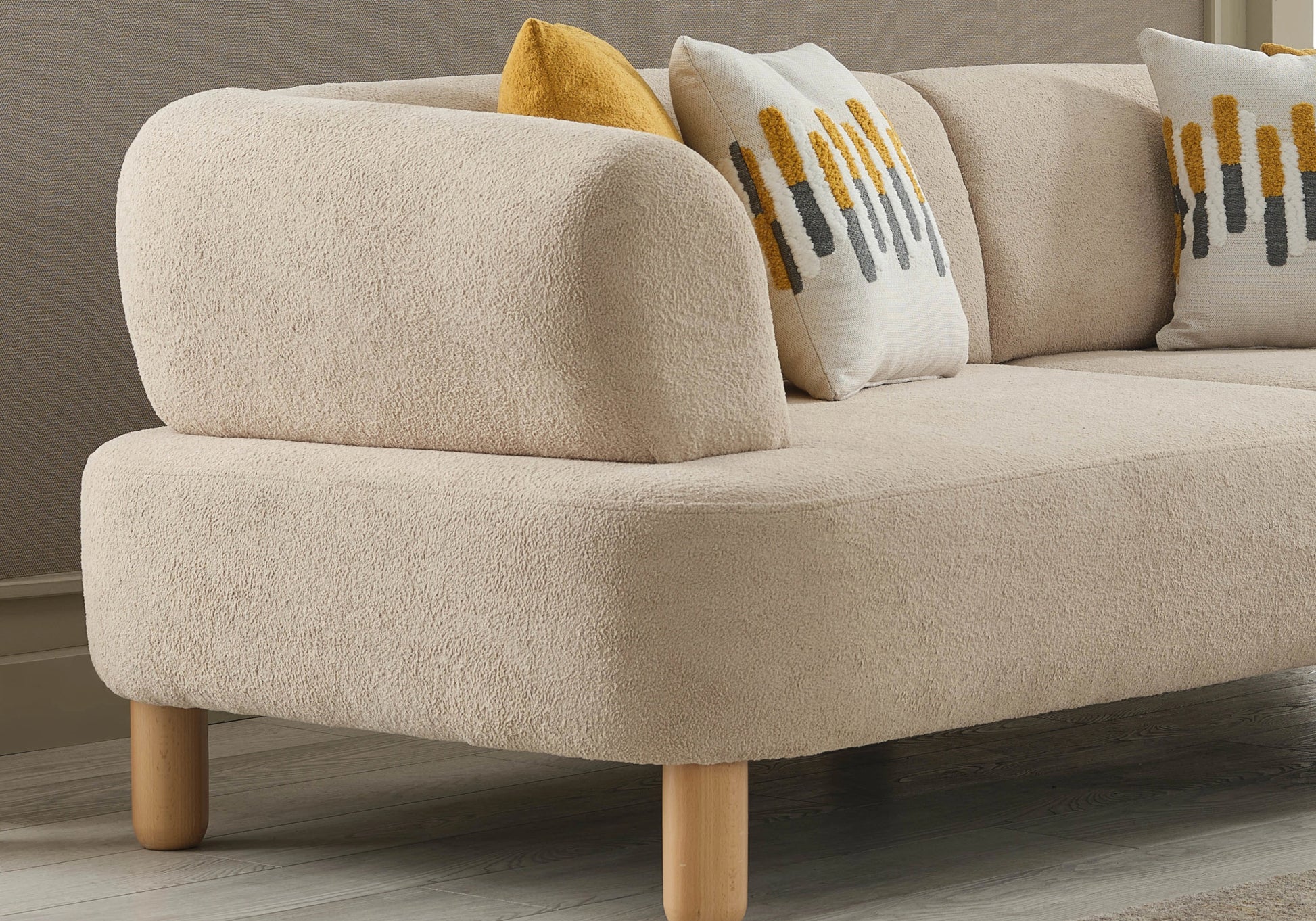 Ce design fluide crée un effet cocon, renforcé par la texture du tissu bouclé. L’ensemble du canapé donne une impression de volume léger, comme suspendu dans l’espace, notamment grâce aux pieds en bois clair naturel qui surélèvent la structure.