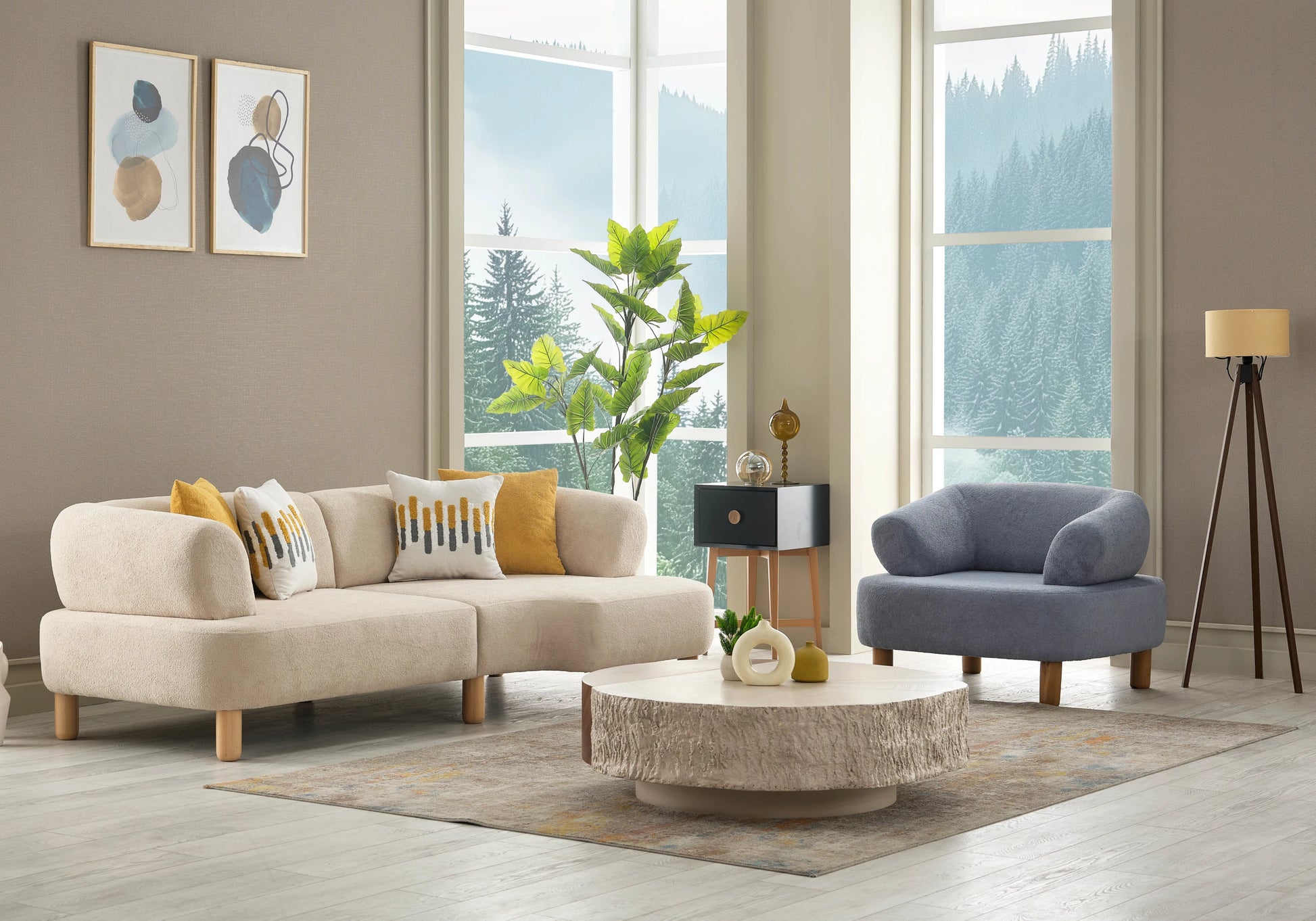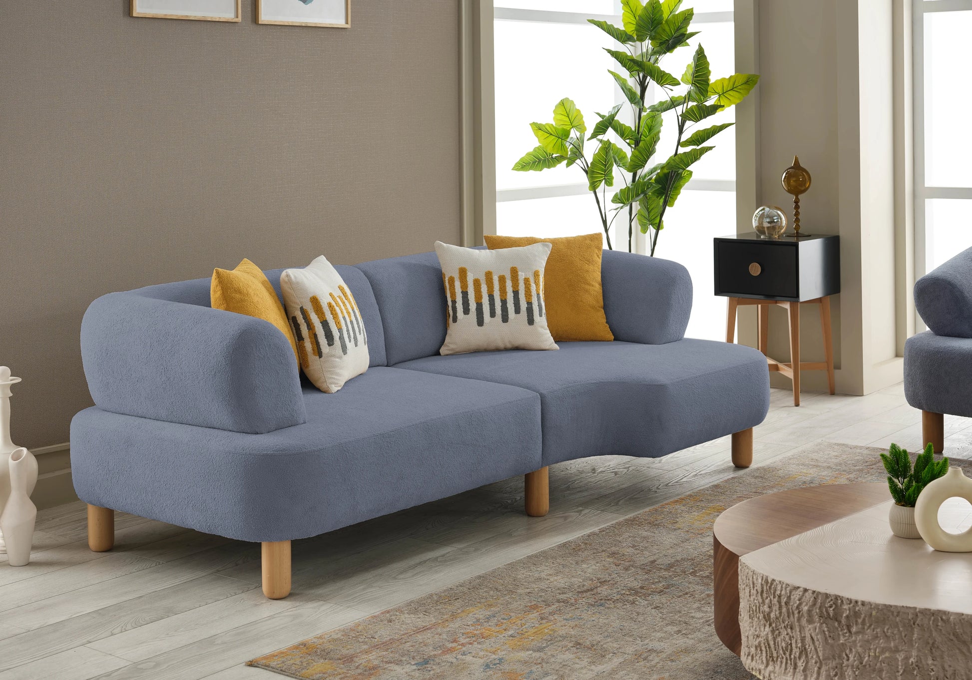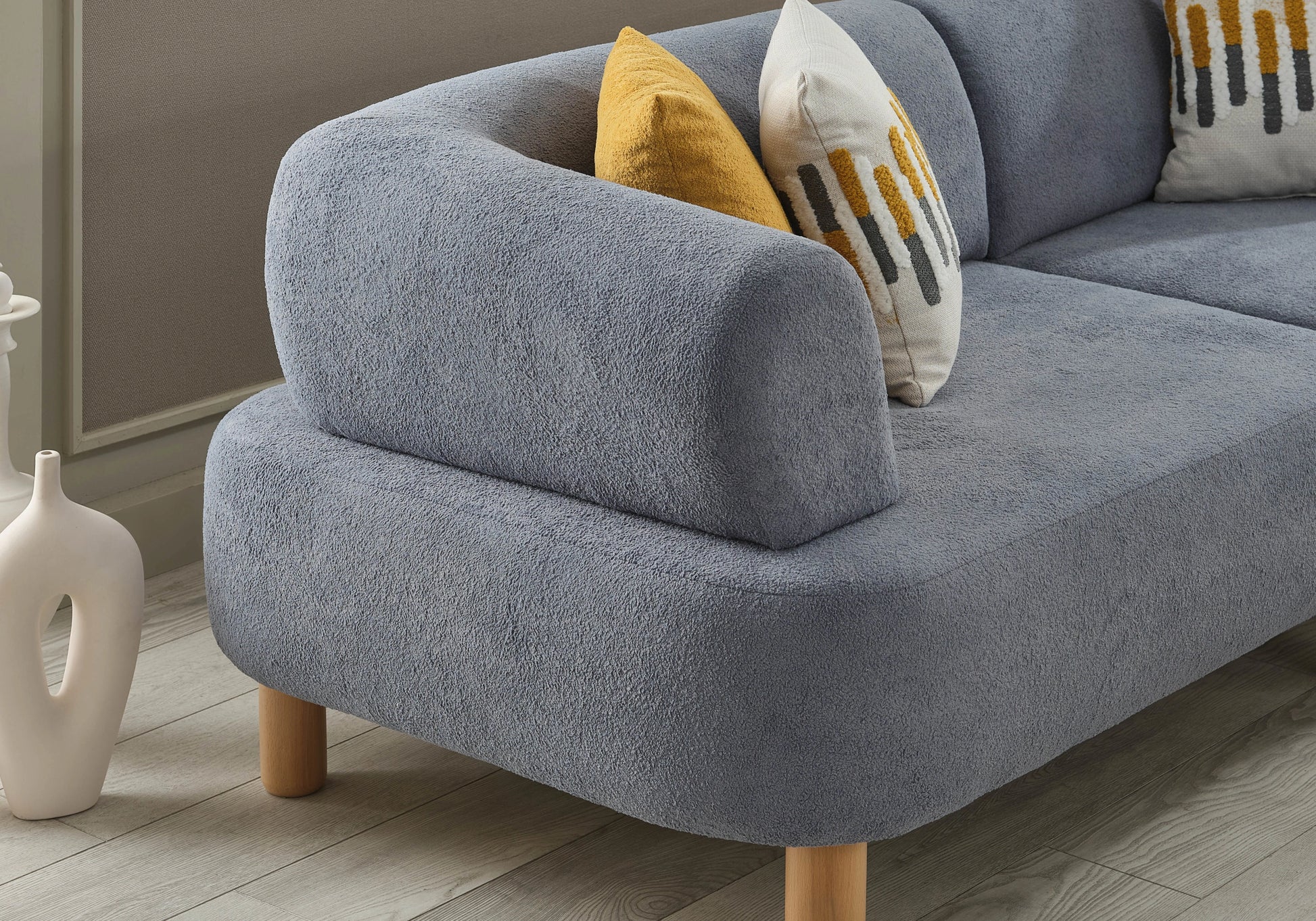 Le revêtement bouclé, ultra doux au toucher, est non seulement tendance mais aussi résistant à l’usage quotidien. Il capte la lumière, donne du relief et rend le canapé visuellement plus accueillant. En beige, il apaise et agrandit l’espace. En gris bleu, il apporte une touche contemporaine et élégante.