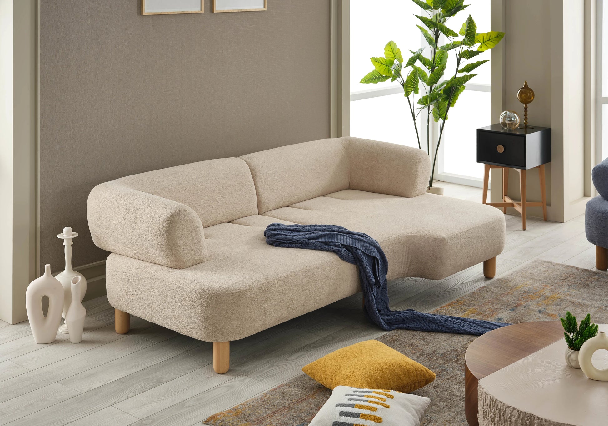 Un canapé bouclé méridienne dossier réglable sculpté pour le bien-être : assise profonde, dossier mobile, tissu bouclé moelleux et pieds bois chaleureux. Un cocon moderne au style unique.