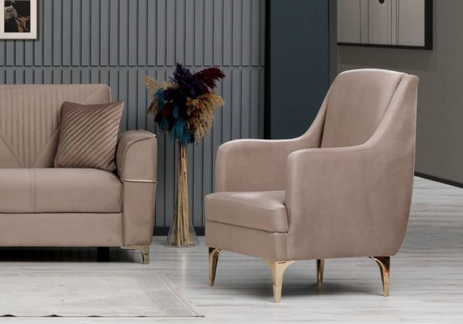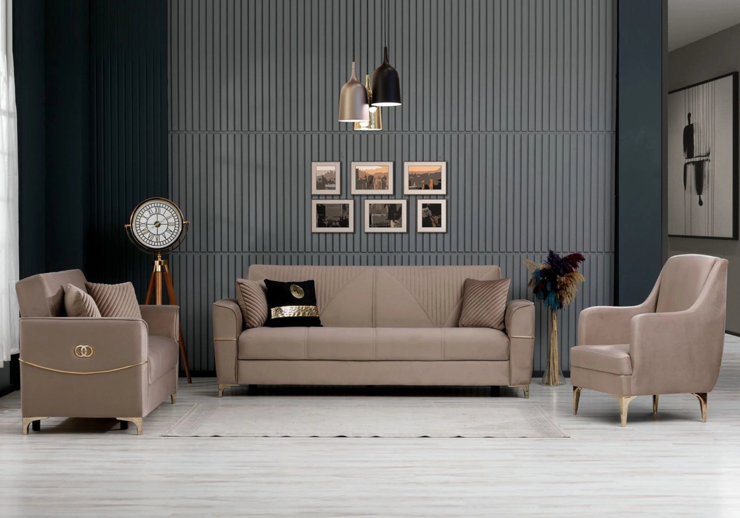Chaque version reprend les codes esthétiques forts du modèle : velours beige, pieds dorés, coussin noir à motif doré façon Versace, et médaillon doré sculpté sur les accoudoirs. Ensemble, ils forment un salon haut de gamme cohérent et somptueux.