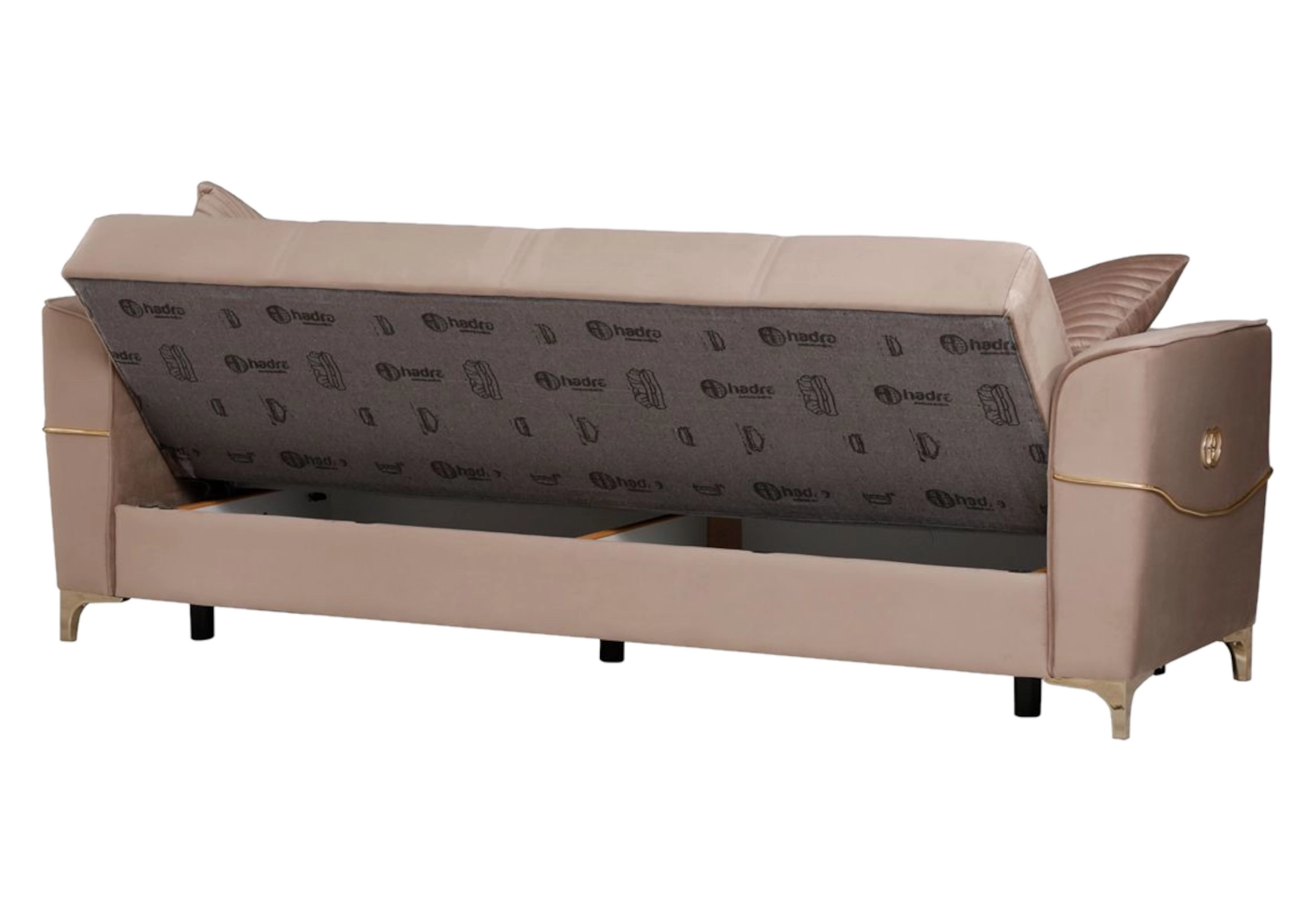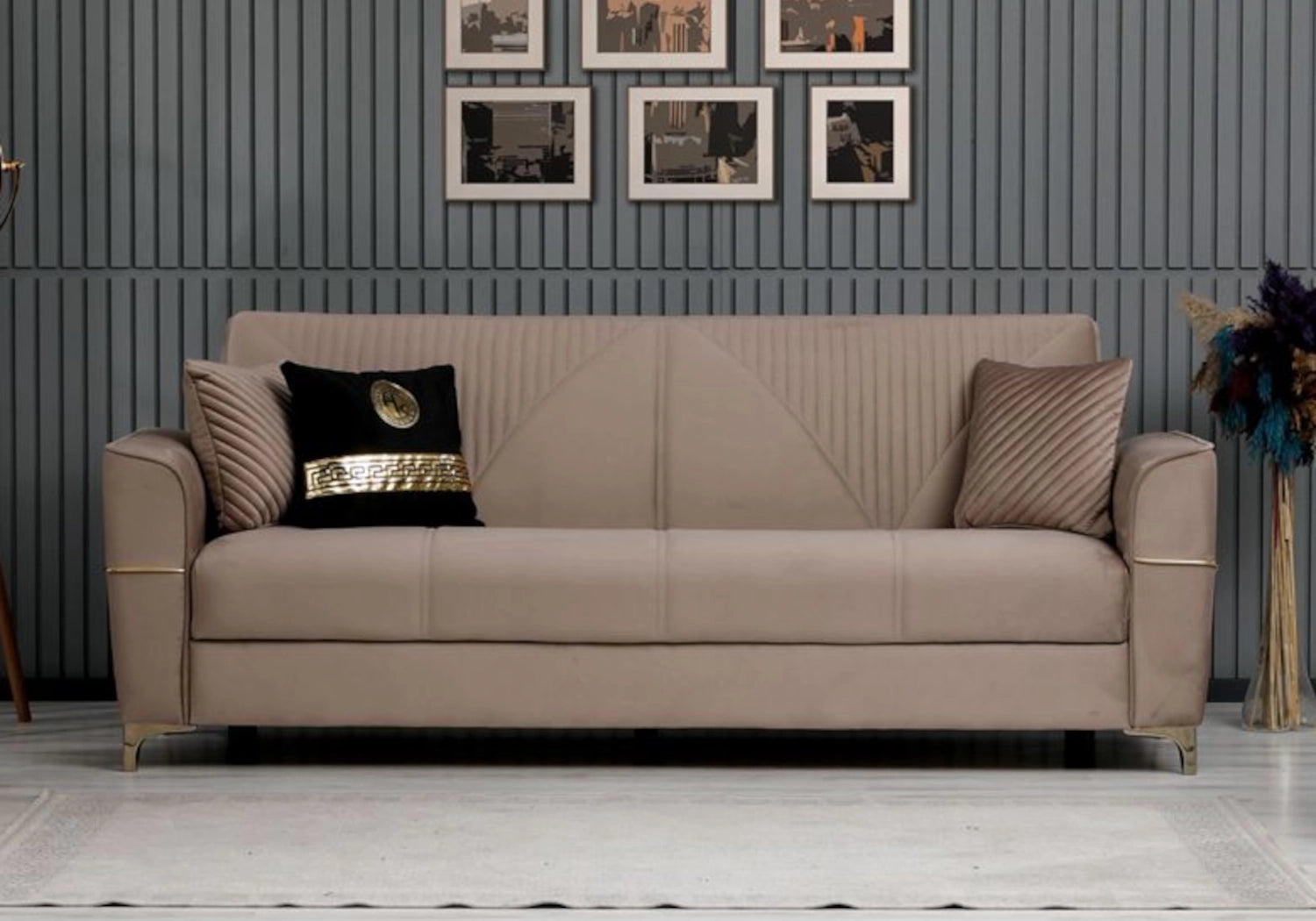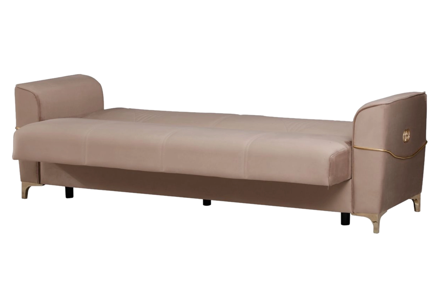 Le canapé PORTO allie l'esthétique haut de gamme à l'intelligence fonctionnelle. Son velours beige lumineux, ses finitions dorées élégantes et son système lit + coffre discret en font un choix idéal pour les intérieurs contemporains en quête de prestige et de confort.