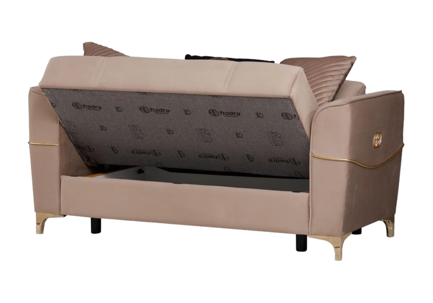 Ce modèle transforme votre pièce en un espace à la fois chaleureux et sophistiqué. Chaque détail – du médaillon doré aux coussins déco – évoque l'héritage des plus beaux meubles turcs et italiens, tout en vous offrant un couchage et un rangement dissimulés.