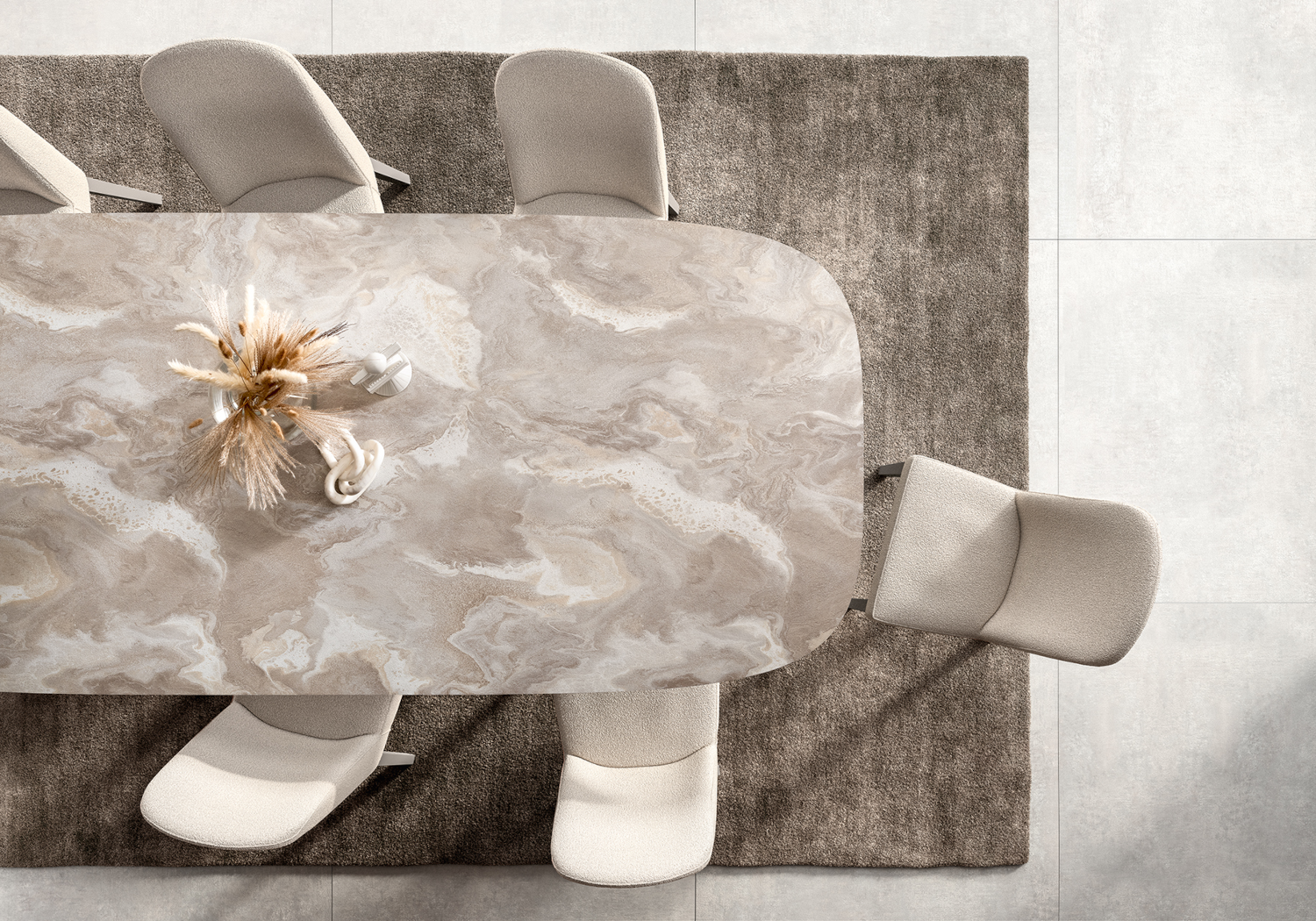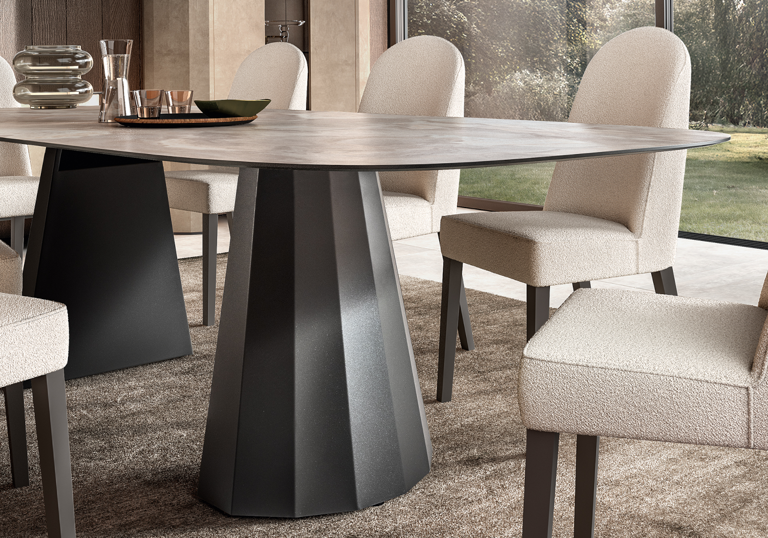 La chaise Dune incarne l’élégance italienne dans une version douce et contemporaine. Son revêtement en tissu bouclé apporte une texture chaleureuse et raffinée, idéale pour sublimer une salle à manger ou un espace de réception avec subtilité.