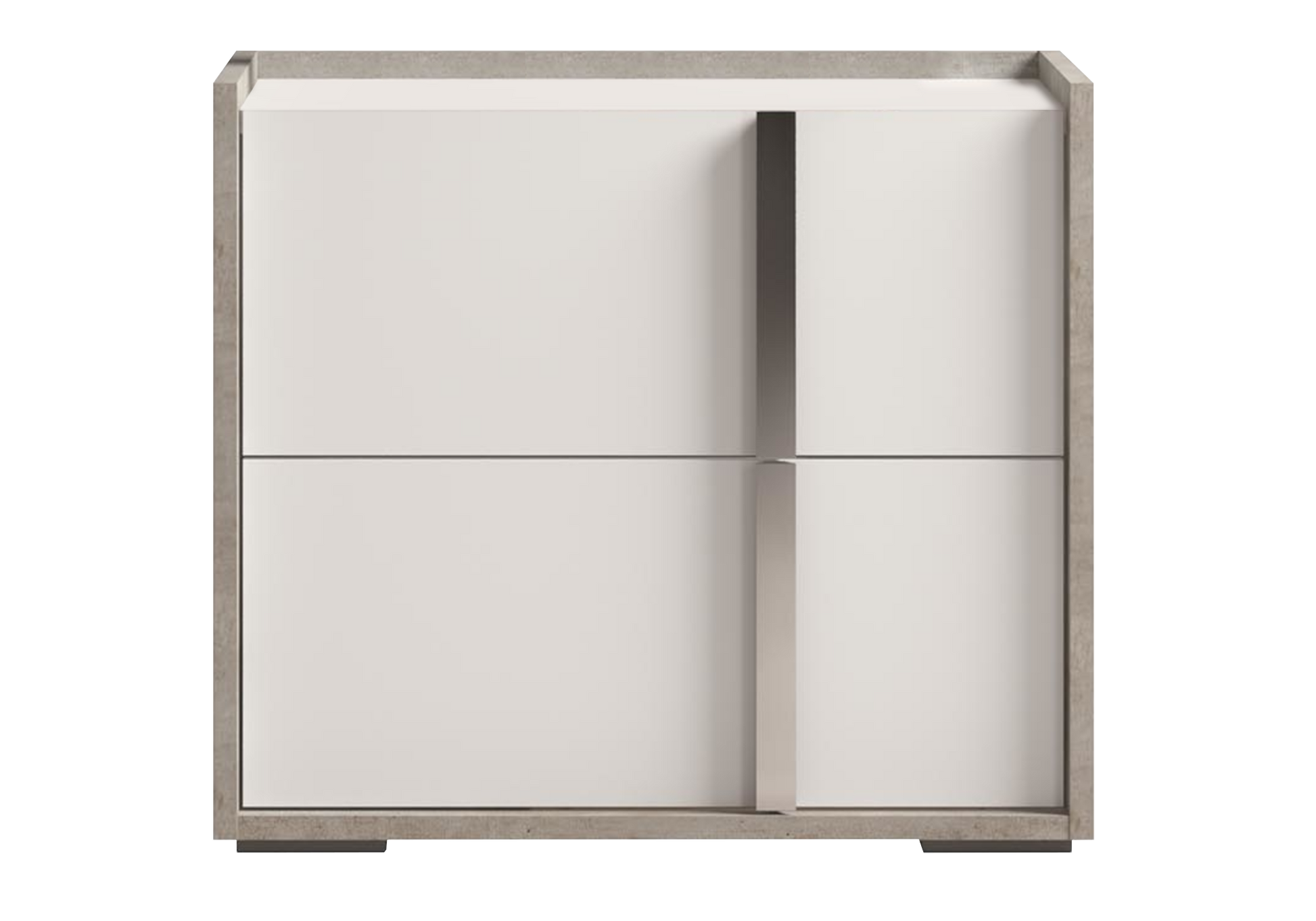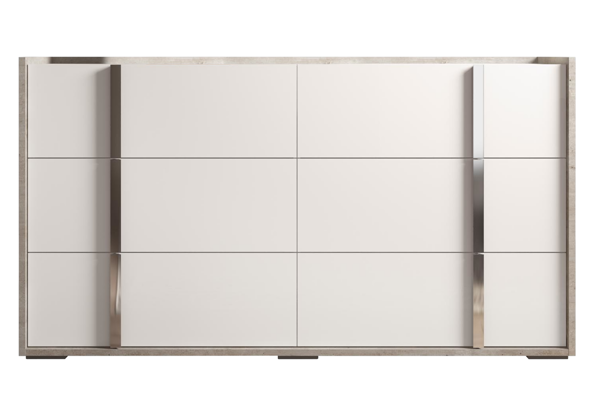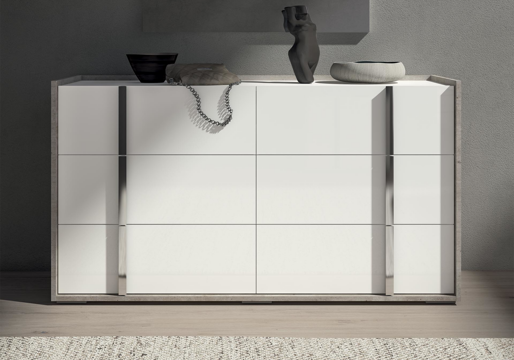 La chambre Treviso compose un ensemble élégant associant blanc laqué brillant et décor effet béton. Cette combinaison moderne crée un espace nuit lumineux et structuré, inspiré du design italien contemporain.