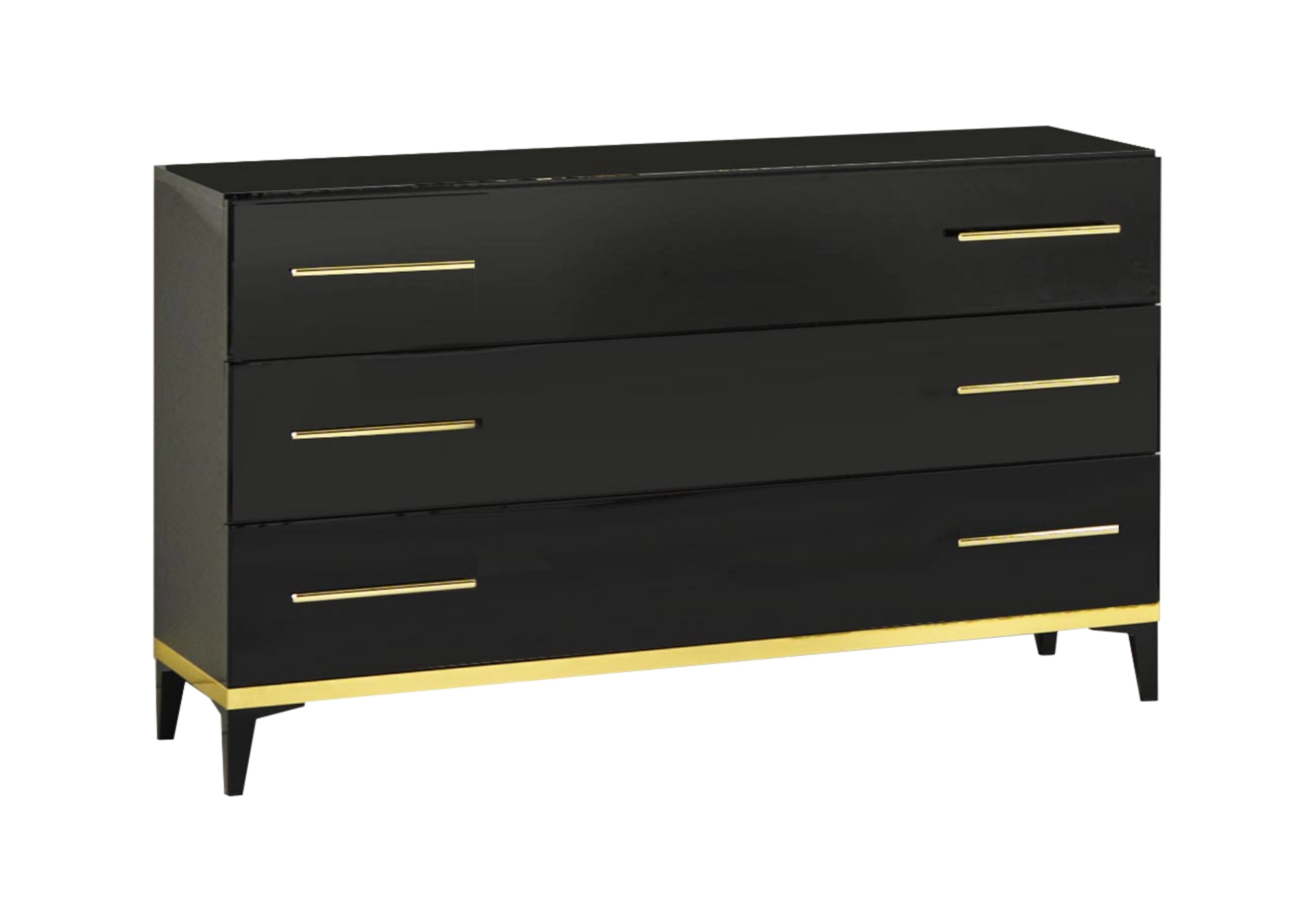 - Commode 3 tiroirs à façade brillante, soulignée d’un profil doré.