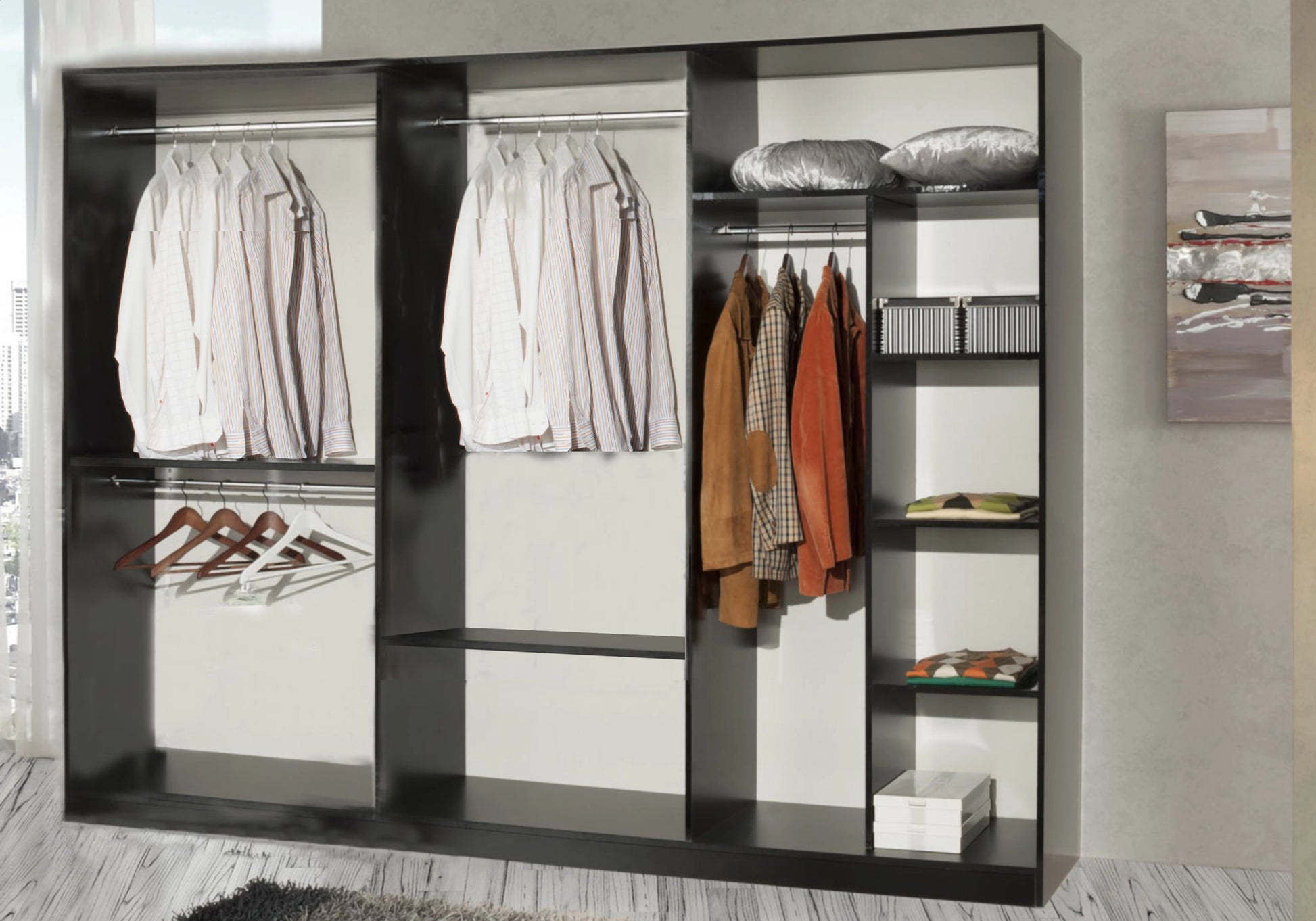 - Armoire 4 portes miroir avec penderie et étagères modulables.