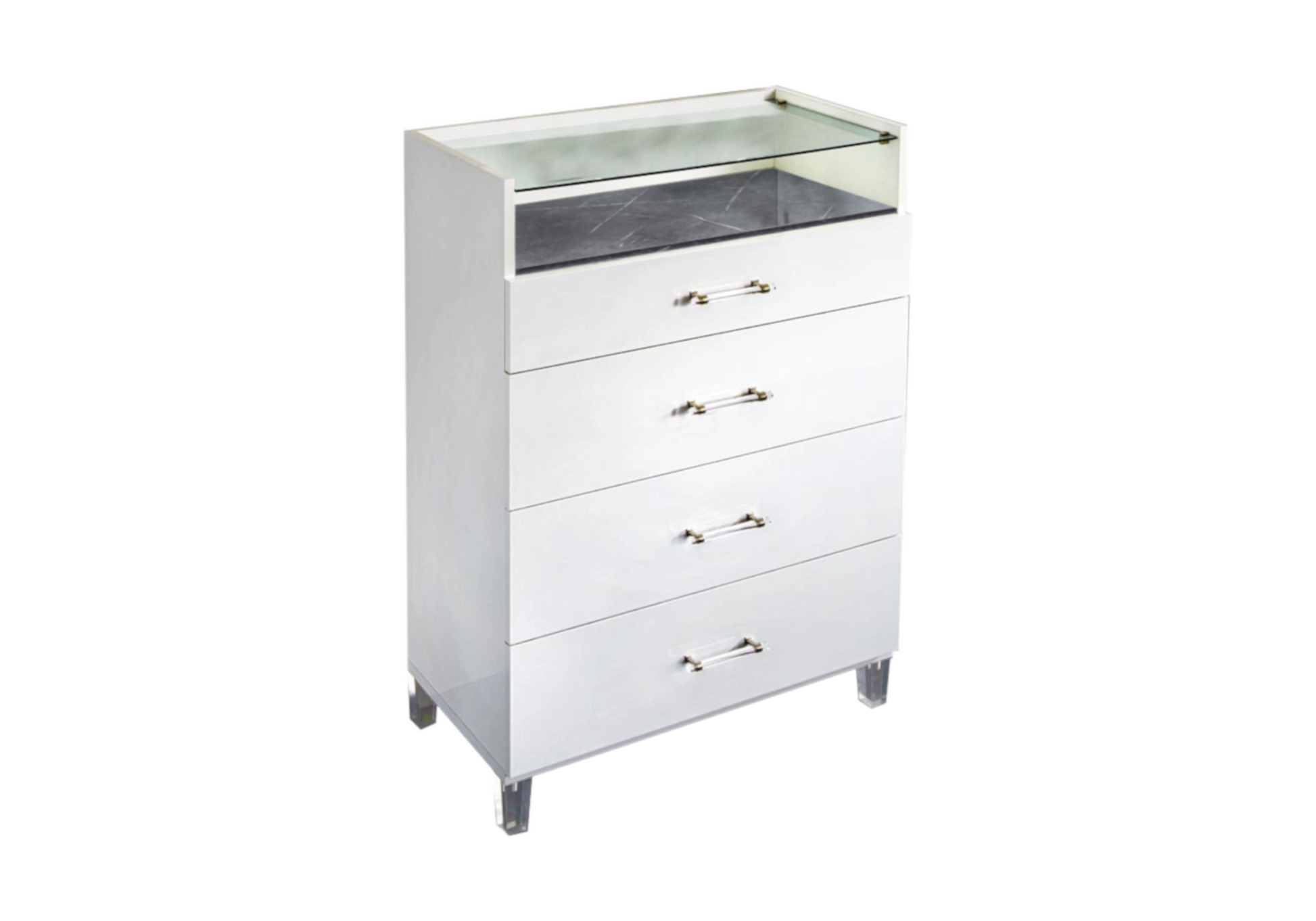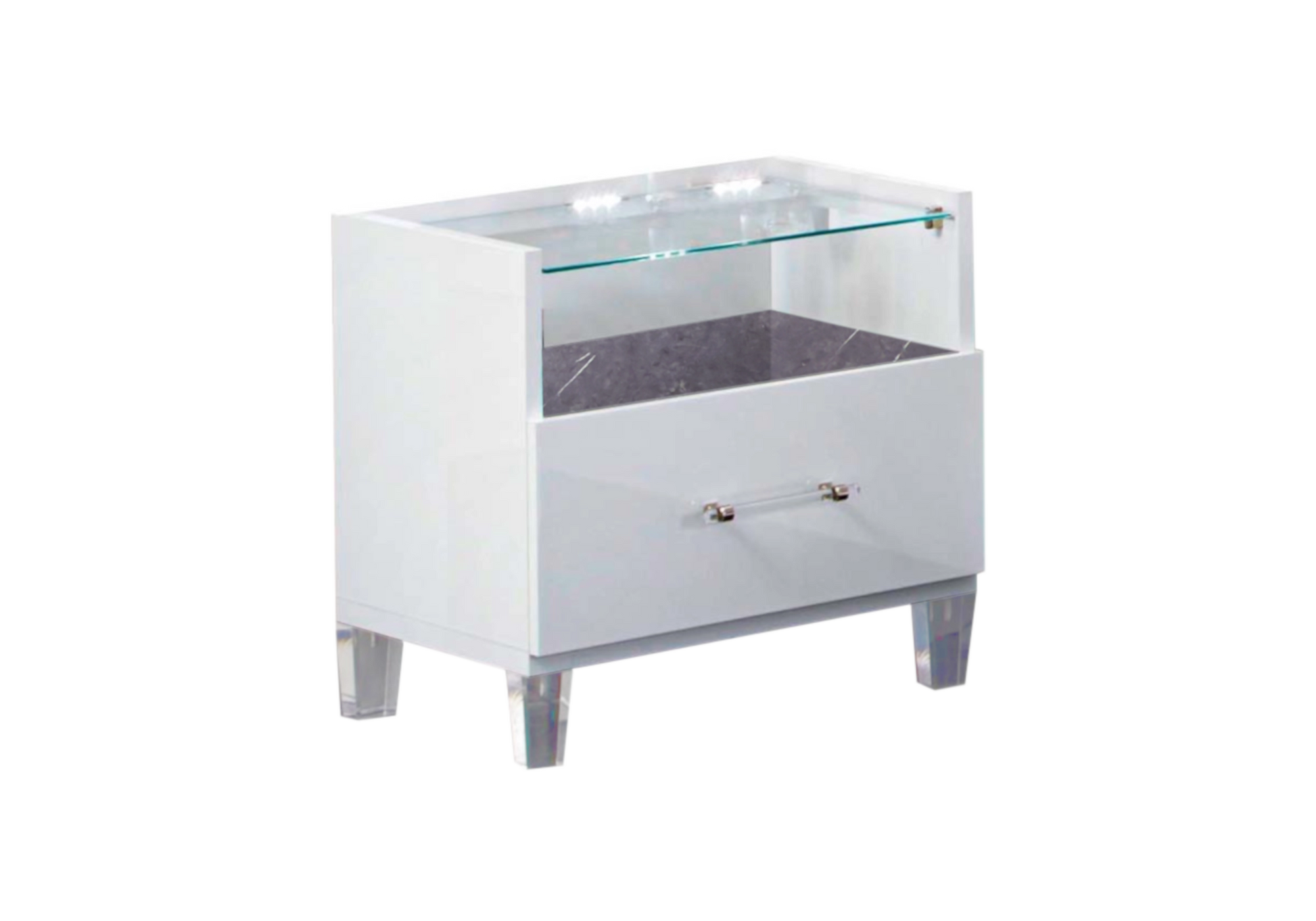 Les plateaux en verre trempé des commodes et chevets ajoutent une touche de transparence et de noblesse. Quant aux poignées transparentes cerclées d’un anneau argenté, elles complètent le design avec une discrète brillance.