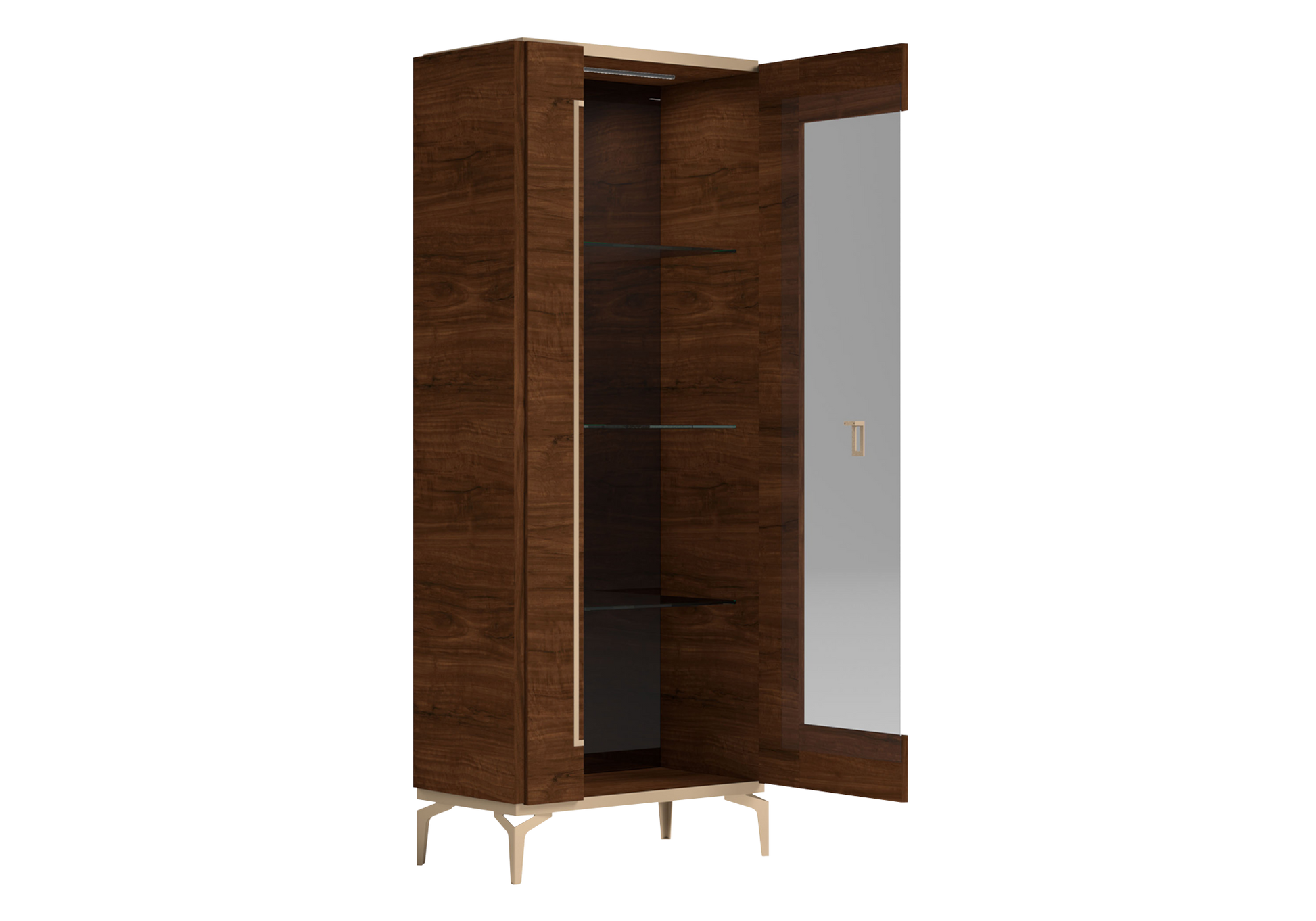 Un ensemble harmonieux réunissant 2 vitrines colonnes LED, meuble TV 195 cm, table extensible 180–225 cm et 4 chaises velours beige pour structurer salon et salle à manger.