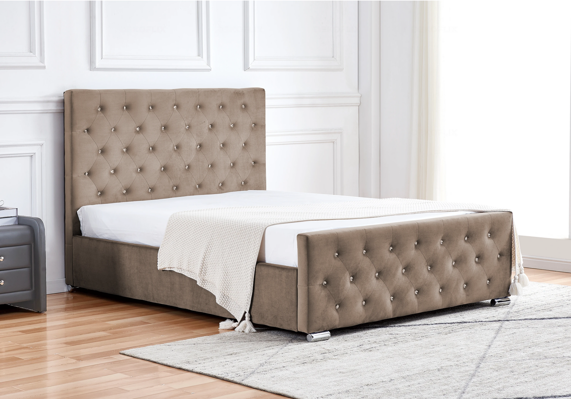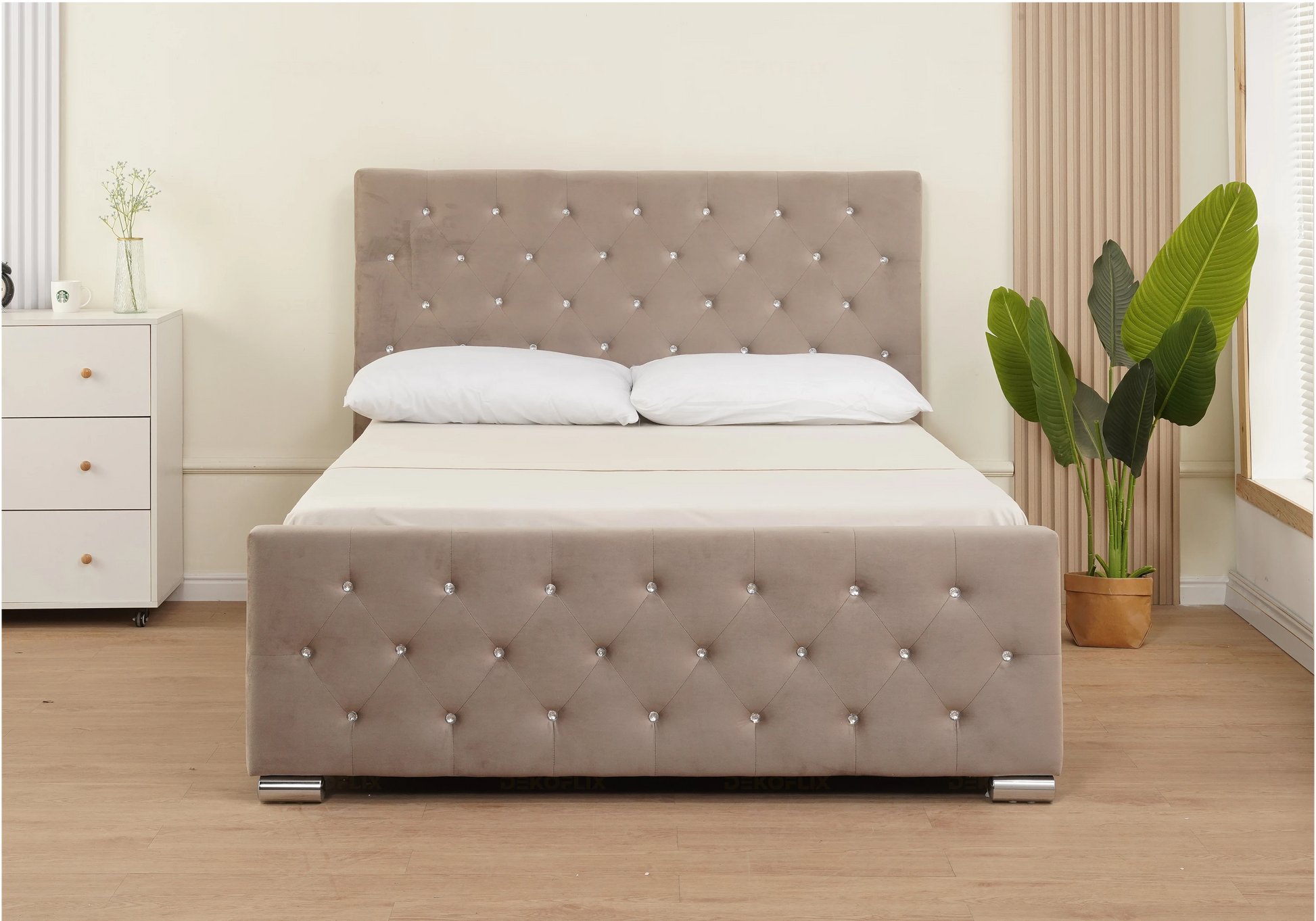 Apportez chaleur et raffinement à votre chambre avec le lit double capitonné en velours taupe avec strass – ANIS. Son revêtement taupe doux et lumineux, allié à une tête de lit ornée de strass scintillants, crée une atmosphère apaisante et haut de gamme.
