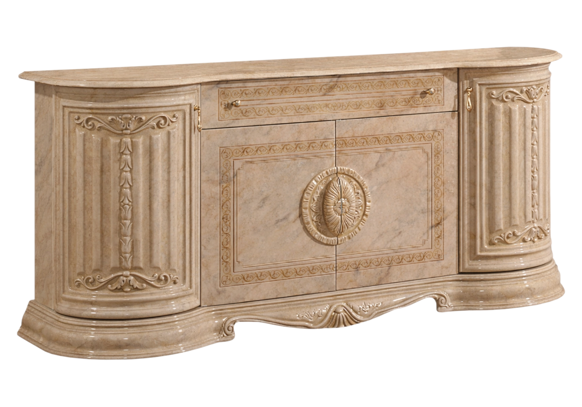 Le buffet baroque beige marbré doré complète l’ensemble avec élégance et fonctionnalité. Ses portes sculptées ornées de motifs floraux dorés et son tiroir central offrent des espaces de rangement pratiques, tout en conservant une esthétique raffinée.