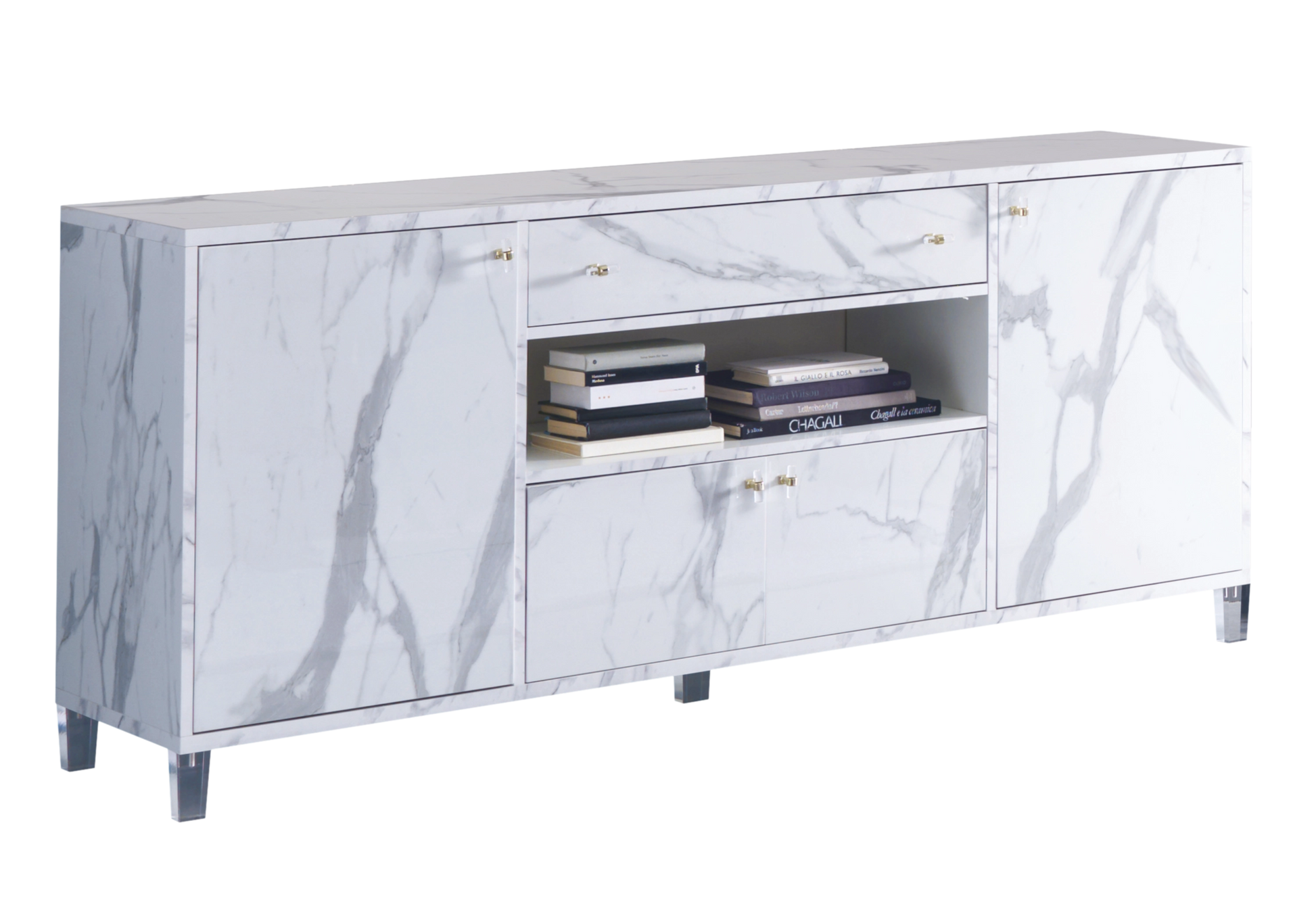 À l’intérieur, des étagères latérales optimisent le rangement tandis qu’une base renforcée par un pied central garantit la stabilité. Les poignées en acrylique transparent soulignent la brillance du meuble et ajoutent une touche de modernité.