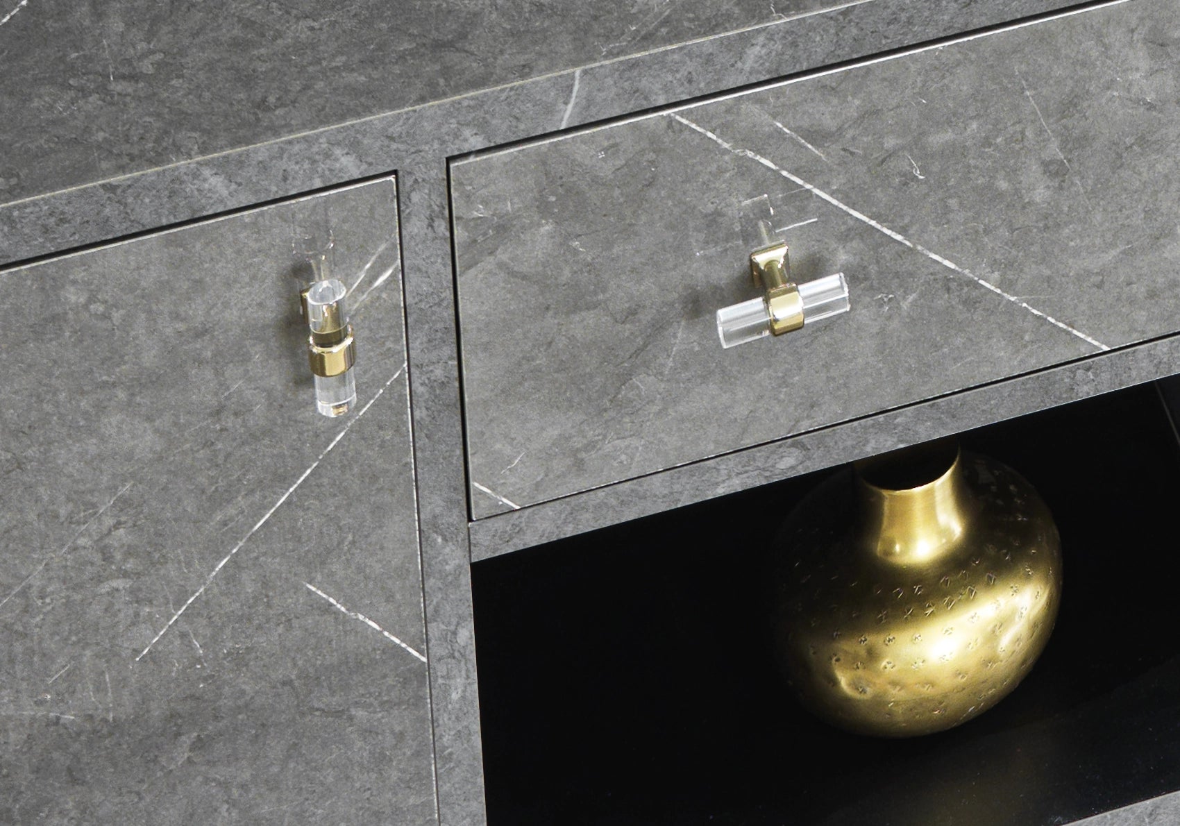 Ses façades en marbre gris brillant captent la lumière naturelle et créent un effet visuel saisissant. À l’intérieur, des étagères latérales spacieuses permettent de ranger aisément la vaisselle et les accessoires de table. Les poignées en acrylique transparent avec anneau doré rappellent l’esprit joaillerie du design italien.