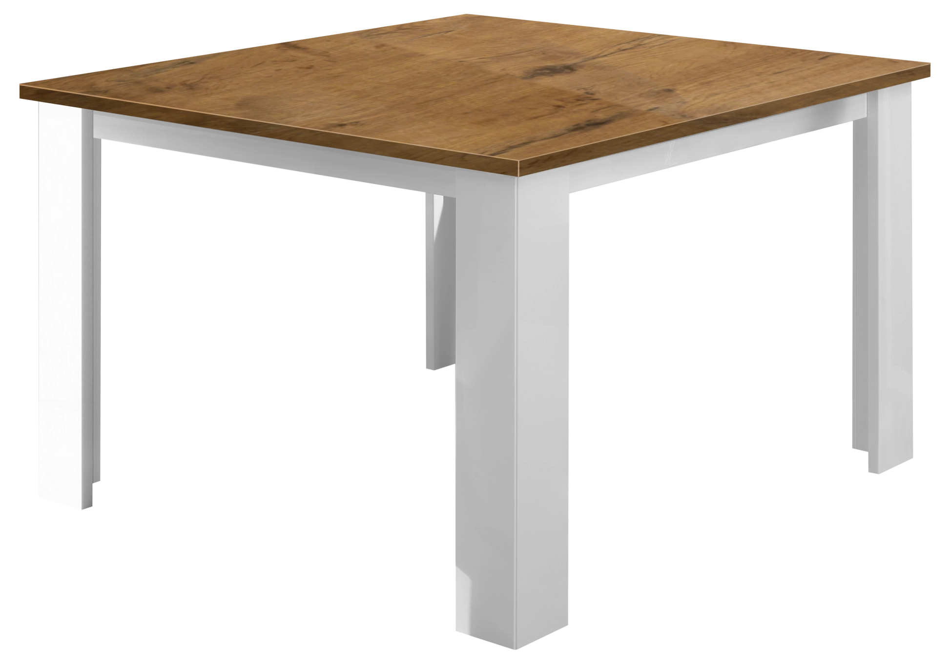 - Une table à manger carrée, au plateau épais et laqué brillant, parfaite pour 4 convives ;