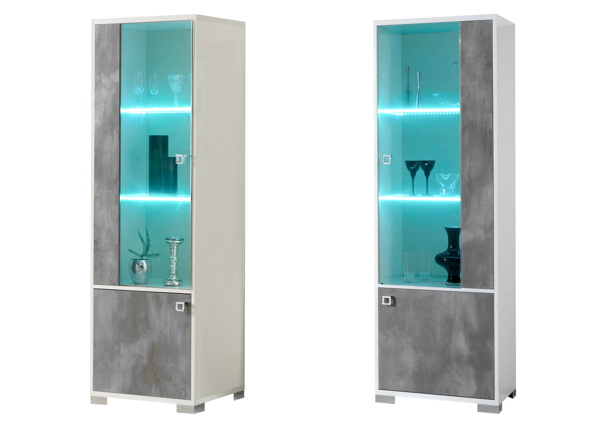 L’éclairage LED intégré dans les vitrines et buffets offre une ambiance lumineuse personnalisable grâce à une télécommande (blanc, bleu ou rouge).