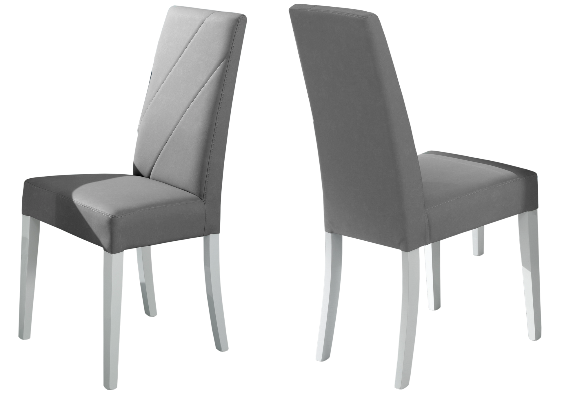 Chaises STELLA : structure hêtre laqué, mousse ignifugée, revêtement simili cuir gris haut de gamme.