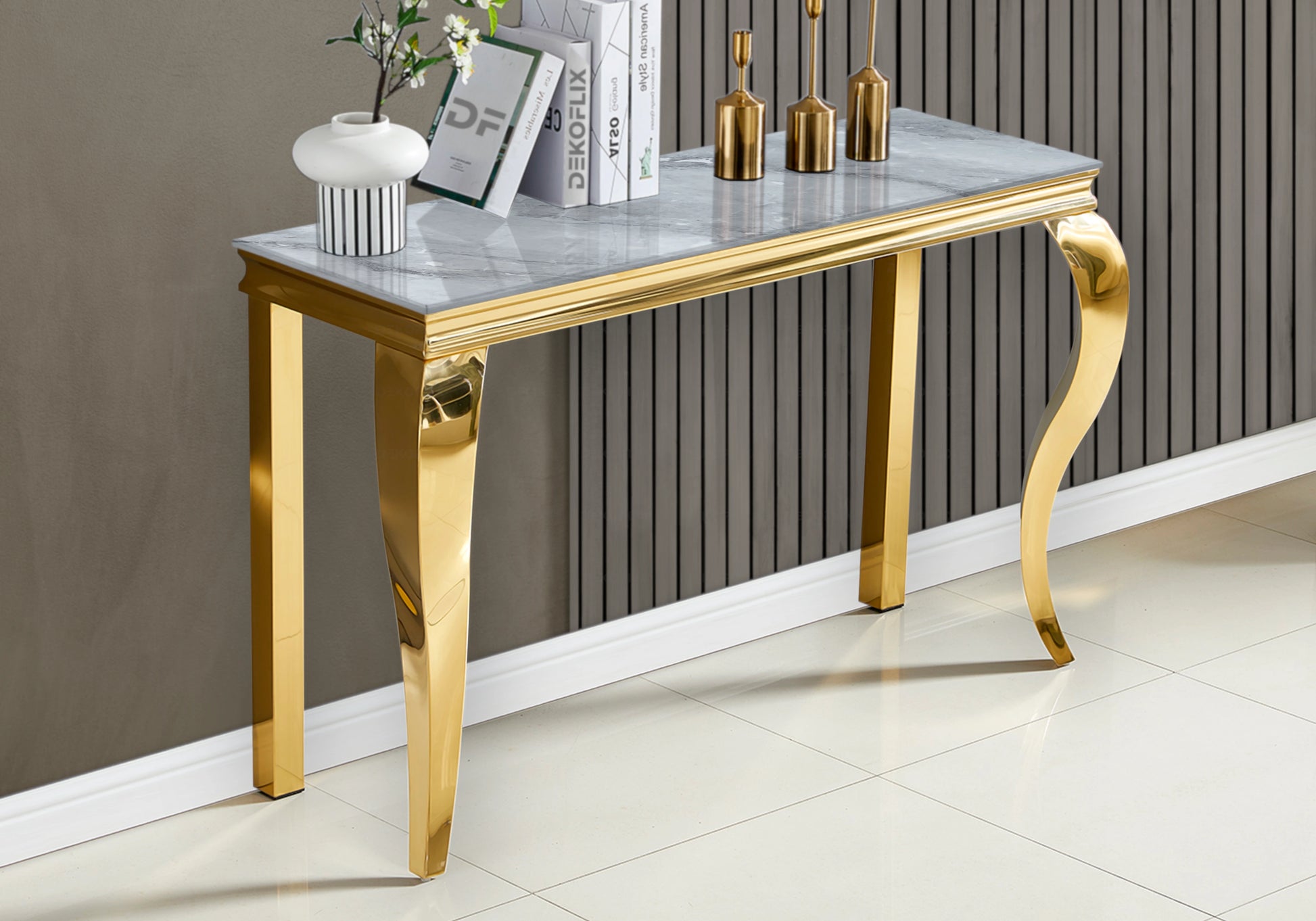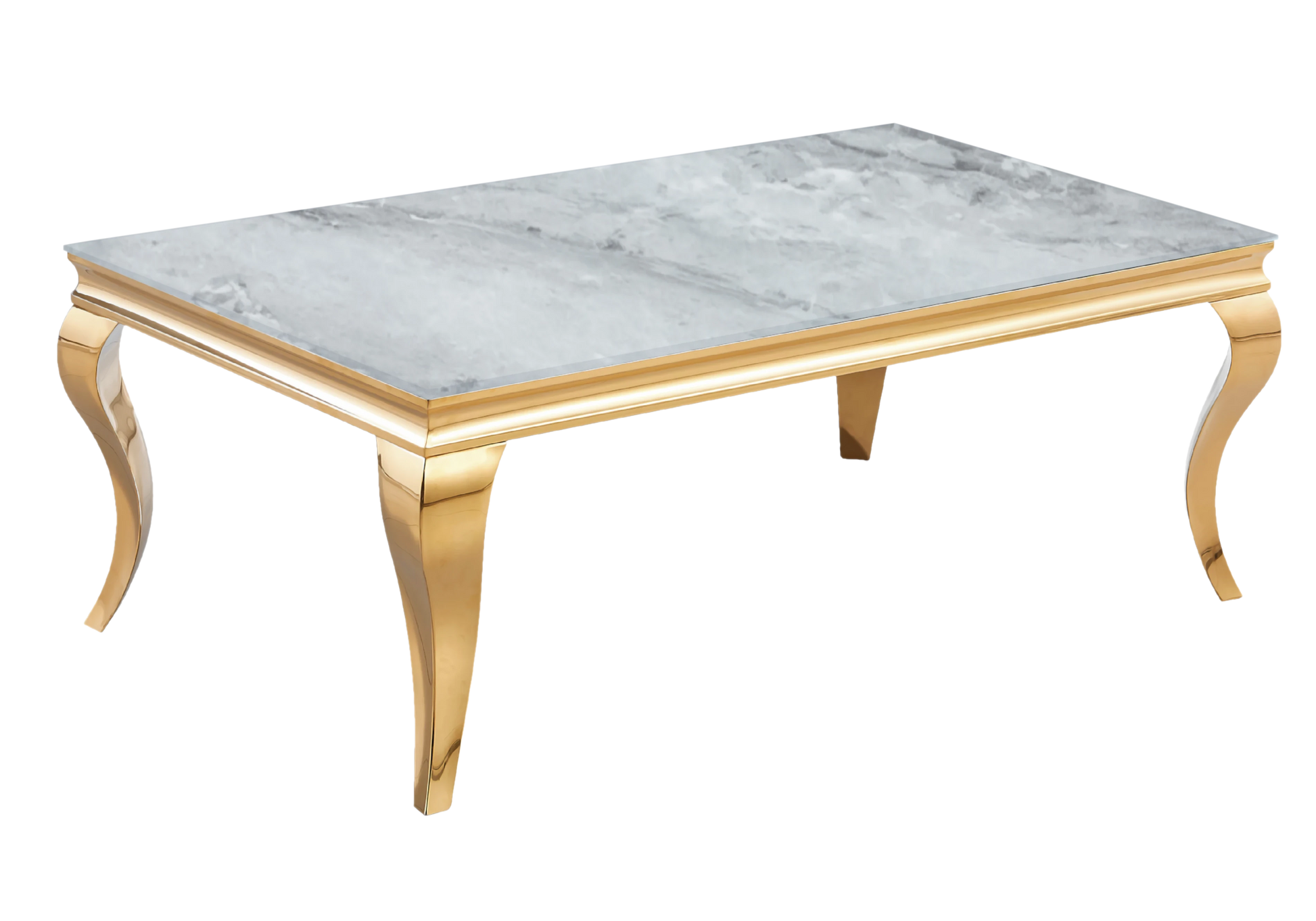 Son plateau effet marbre gris, sublime reflète la lumière tout en assurant robustesse et durabilité. Les pieds dorés en acier inoxydable, à la finition miroir, apportent une touche d’opulence sans excès.