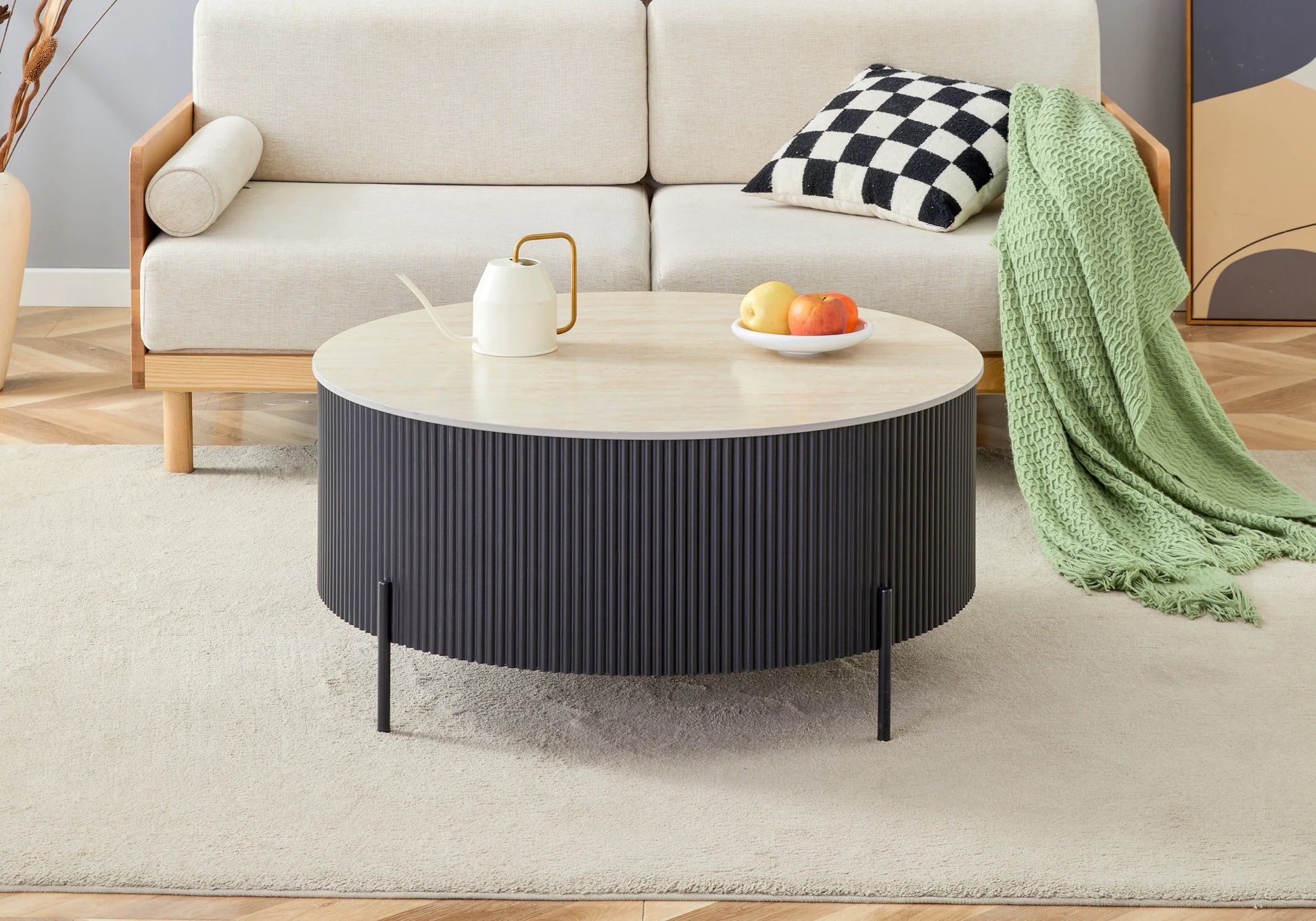 Cette base cylindrique travaillée en relief rythme la lumière, structure la pièce et lui confère un caractère artistique. En finition noir mat, ce pied cannelé crée un contraste fort avec le plateau clair. Le résultat : une table basse à l’esthétique élégante, à la fois moderne, graphique et inspirée du mobilier d’architecte.