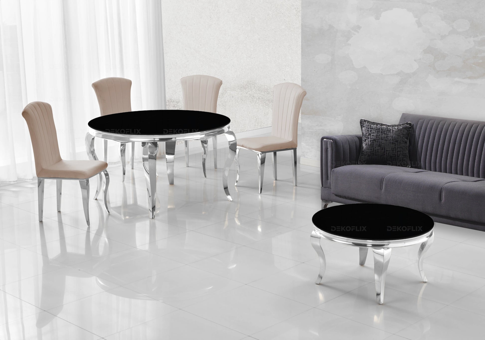 La table basse ronde verre noir NEO séduit par son allure audacieusement élégante. Inspirée du style baroque modernisé, elle combine verre noir trempé et acier chromé pour créer une ambiance luxueuse sans être ostentatoire. Sa forme ronde permet une circulation fluide autour de la table, idéale pour les espaces ouverts et conviviaux.