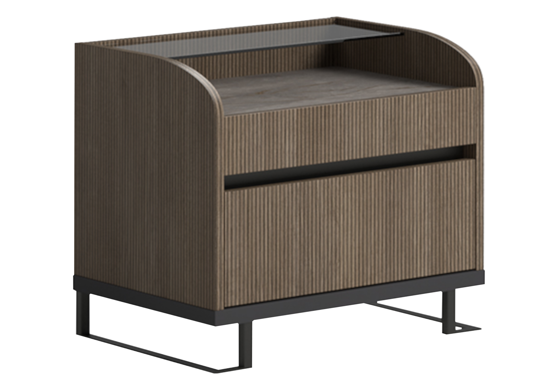 La Table de nuit bois rainuré marbre – Hexagon structure l'espace nuit avec une présence raffinée. Son contraste bois texturé et effet marbre crée une atmosphère élégante et moderne, idéale pour une chambre design haut de gamme.