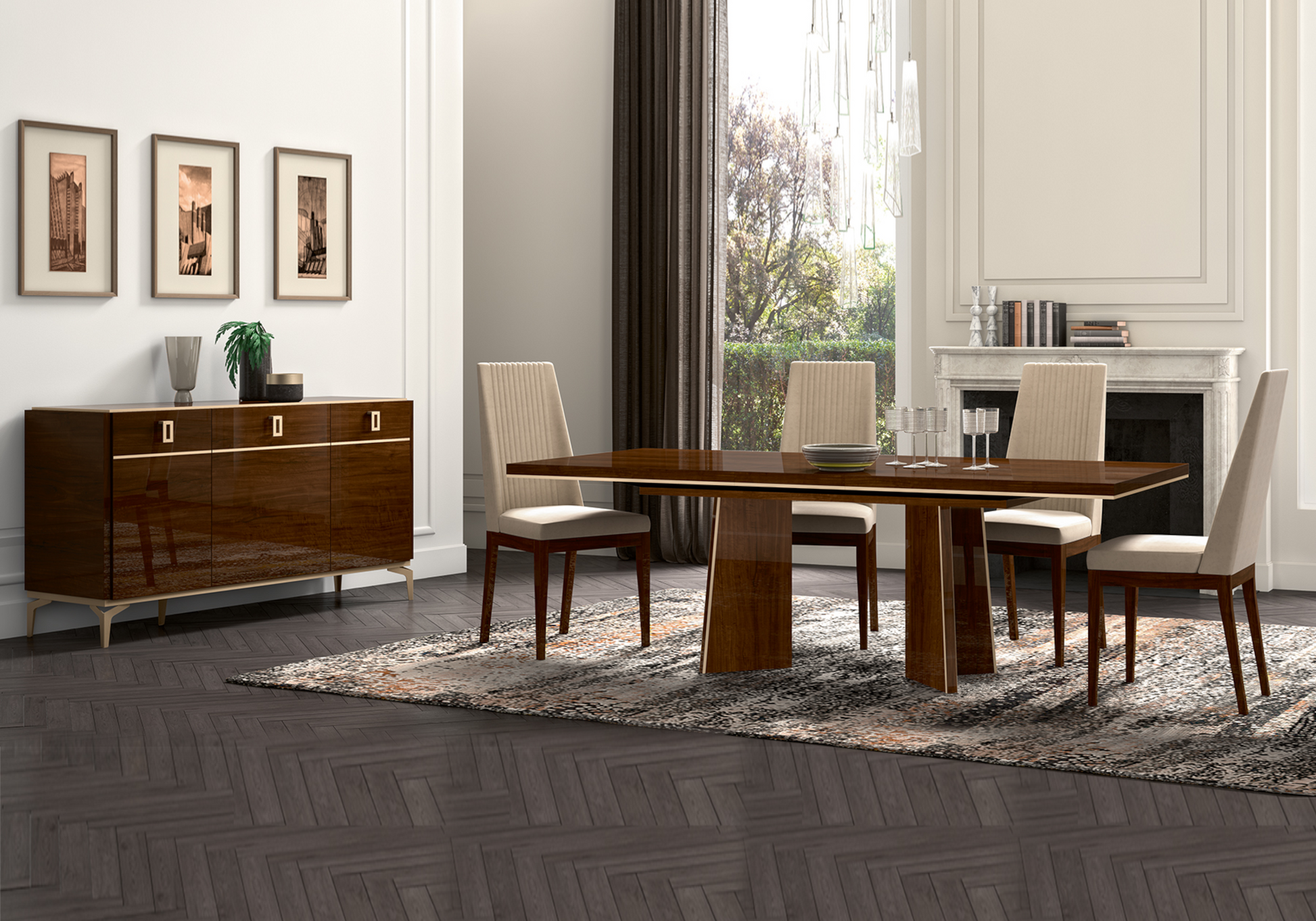 Une table à manger extensible en noyer brillant accompagnée de 4 chaises velours beige. Une solution modulable pour salle à manger contemporaine et réception élargie.