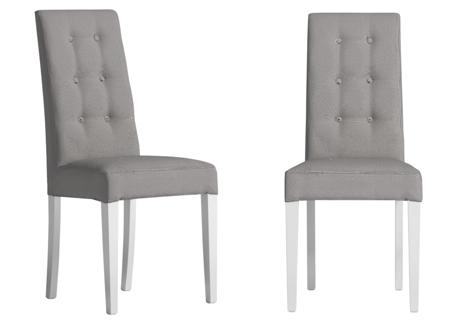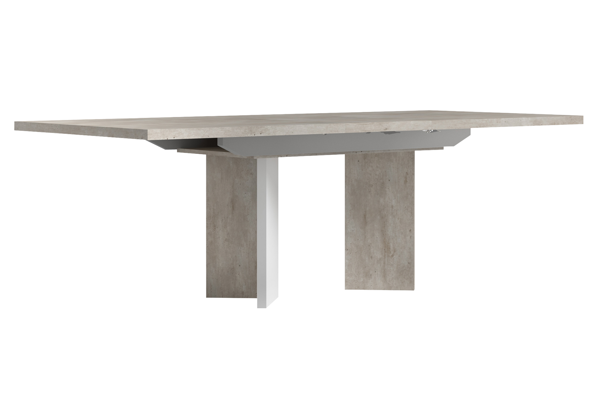 La table extensible Treviso accompagnée de six chaises capitonnées crée une salle à manger élégante et contemporaine. Le contraste entre blanc laqué et effet béton apporte une signature moderne et lumineuse.