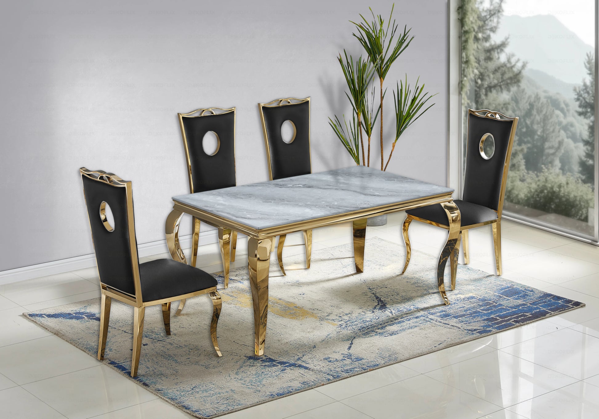 Table marbre gris et chaises simili-cuir noir doré – NEO