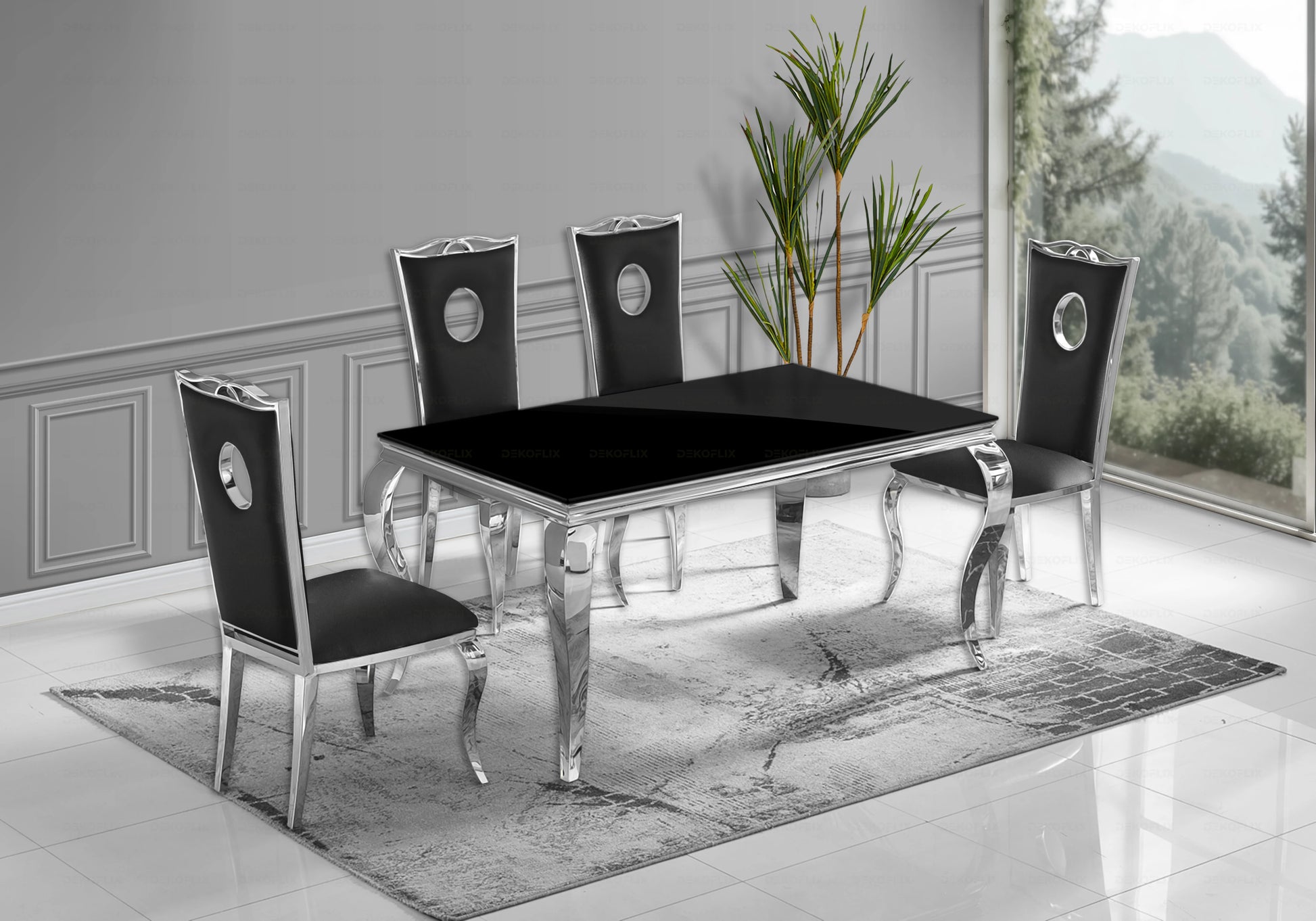 Table verre noir et chaises simili-cuir noir argent – NEO