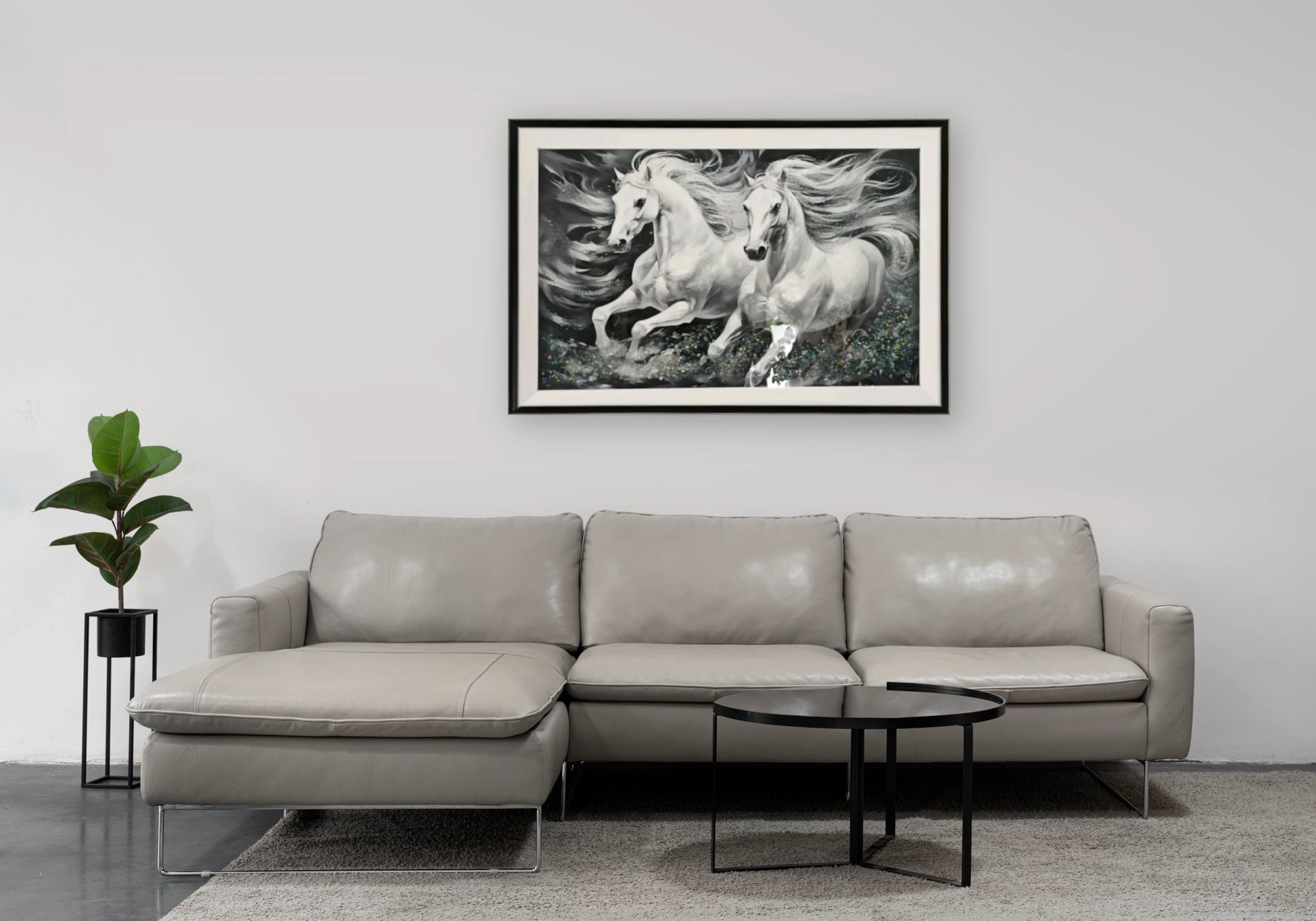 Le tableau STALLION met en scène deux chevaux blancs majestueux lancés dans une course effrénée. Leurs crinières flottent dans un tourbillon de mouvement, incarnant liberté et énergie brute. Cette œuvre impressionne non seulement par la finesse de son dessin, mais aussi par sa profondeur visuelle.