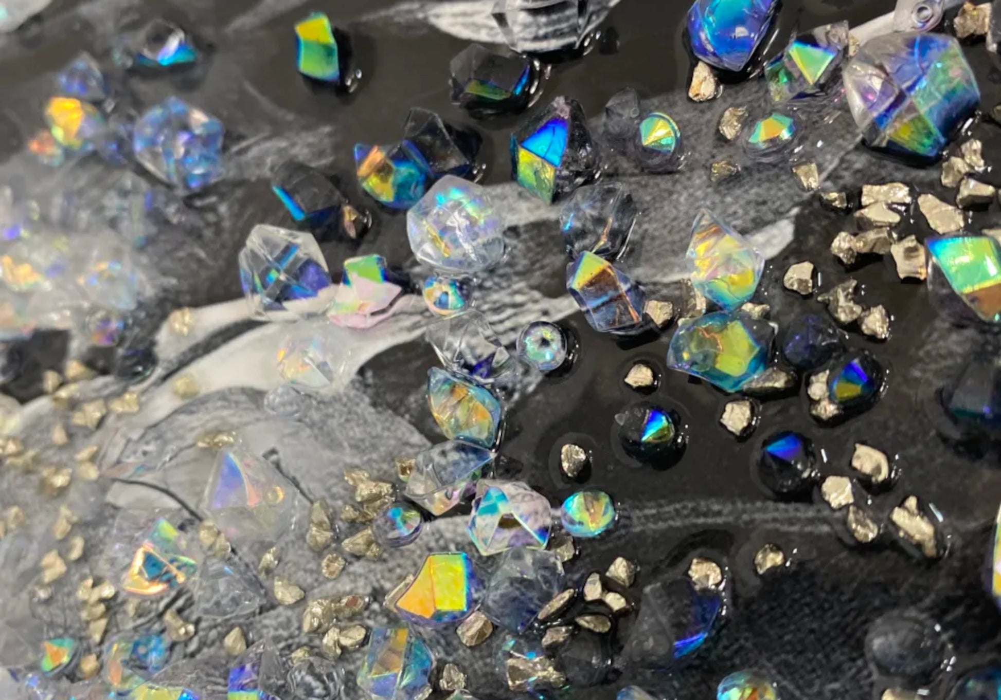 Les cristaux confèrent une texture unique au tableau, créant un jeu subtil entre l’ombre et la lumière, qui attire irrésistiblement l’œil.