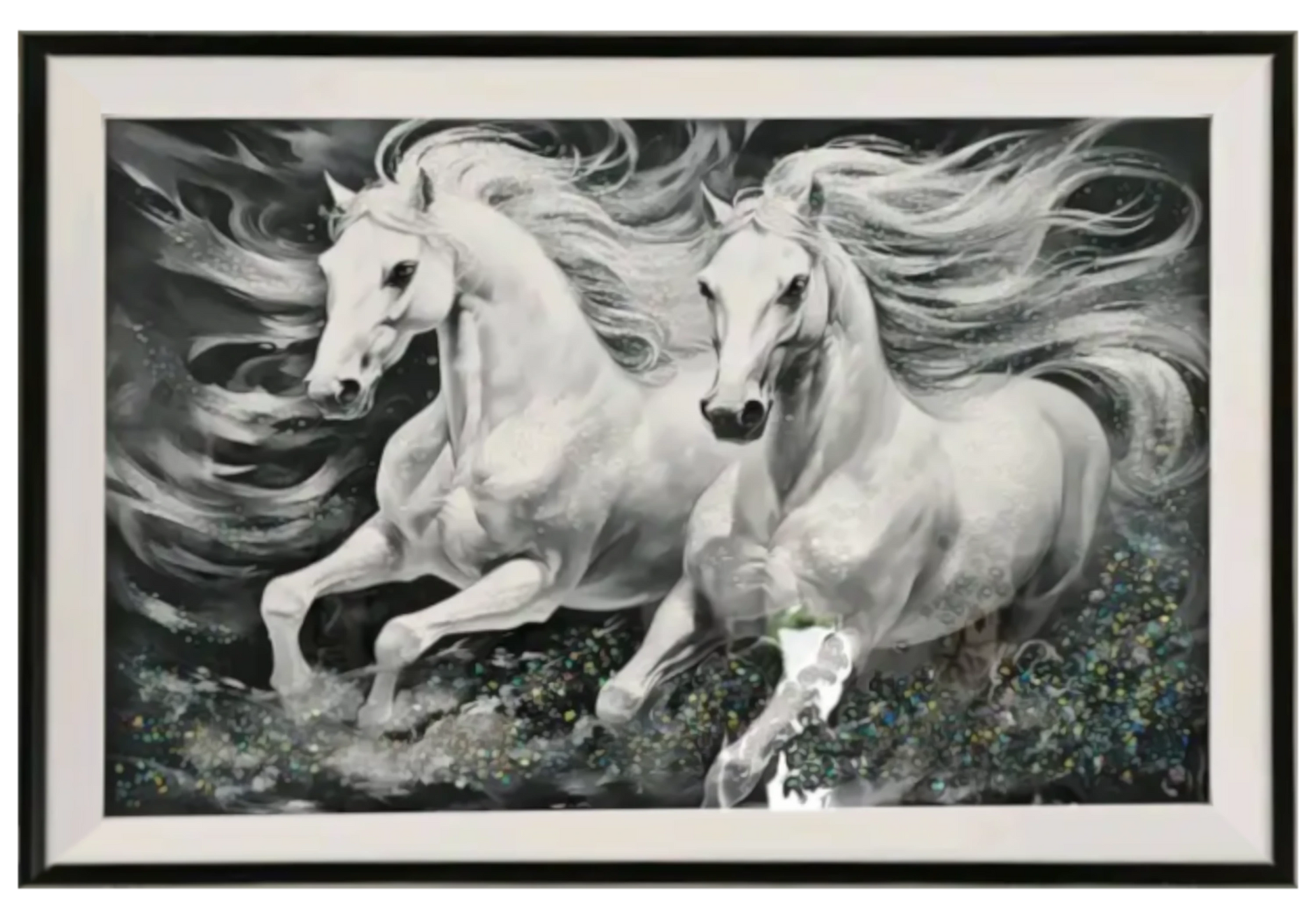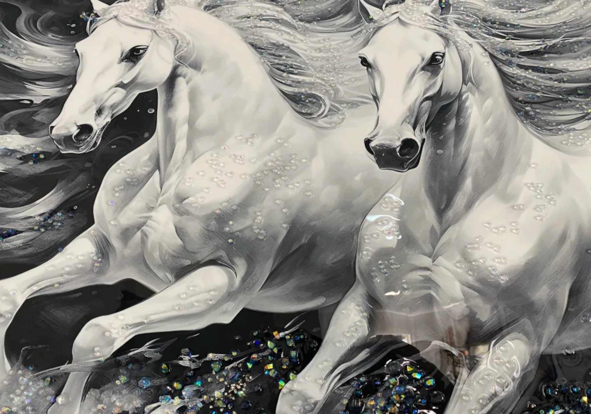 Laissez-vous emporter par l’énergie sauvage de STALLION, un tableau spectaculaire qui met en scène deux chevaux blancs en pleine course, sublimés par des cristaux éclatants. Un chef-d'œuvre qui exprime liberté, puissance et raffinement dans votre intérieur.