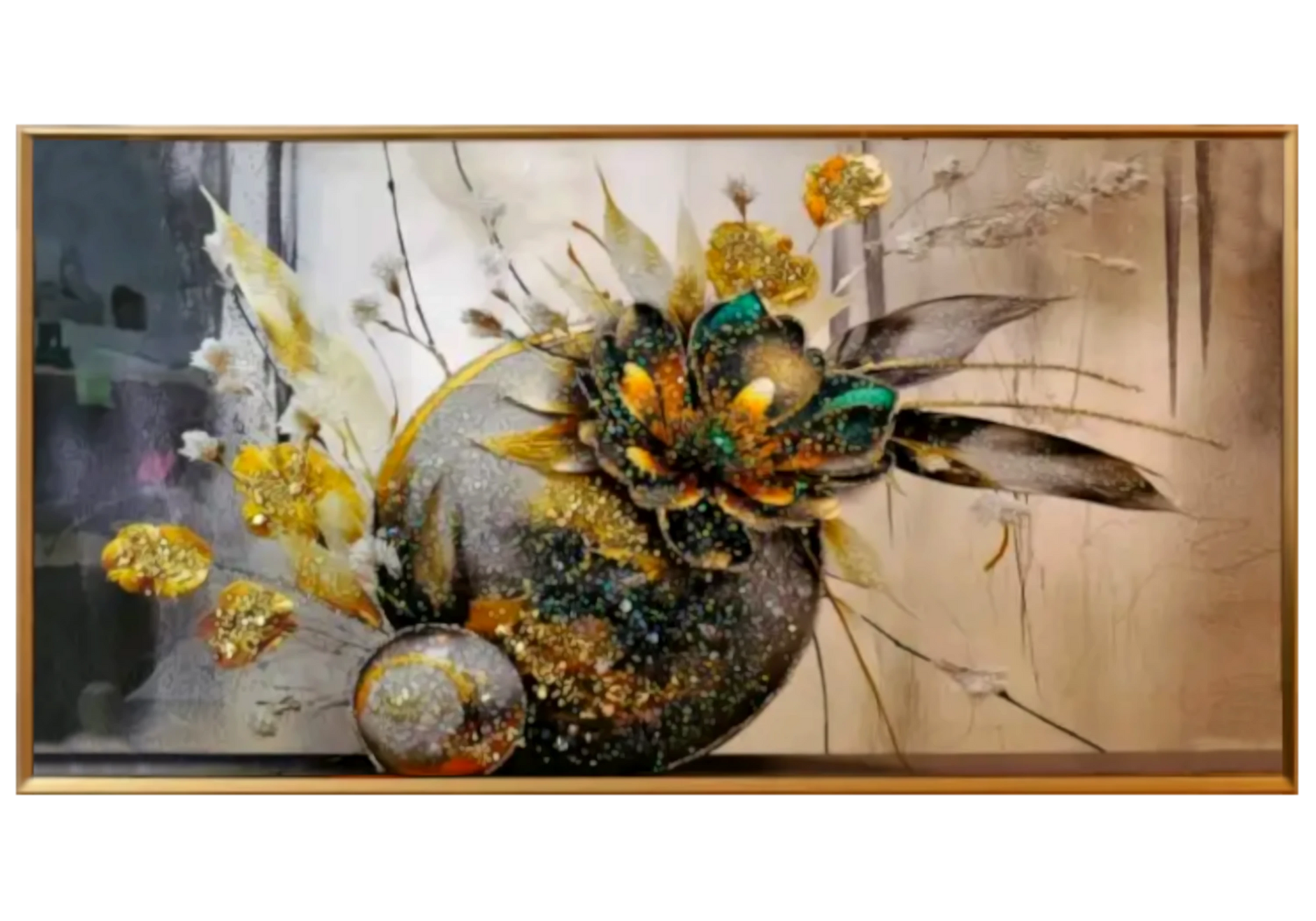 Les nuances vert émeraude, or intense, beige fumé et gris nacré offrent un équilibre parfait entre nature et raffinement. Sur un fond abstrait adouci de touches texturées, cette œuvre s’adapte aussi bien à une déco moderne qu’à un univers classique chic.
