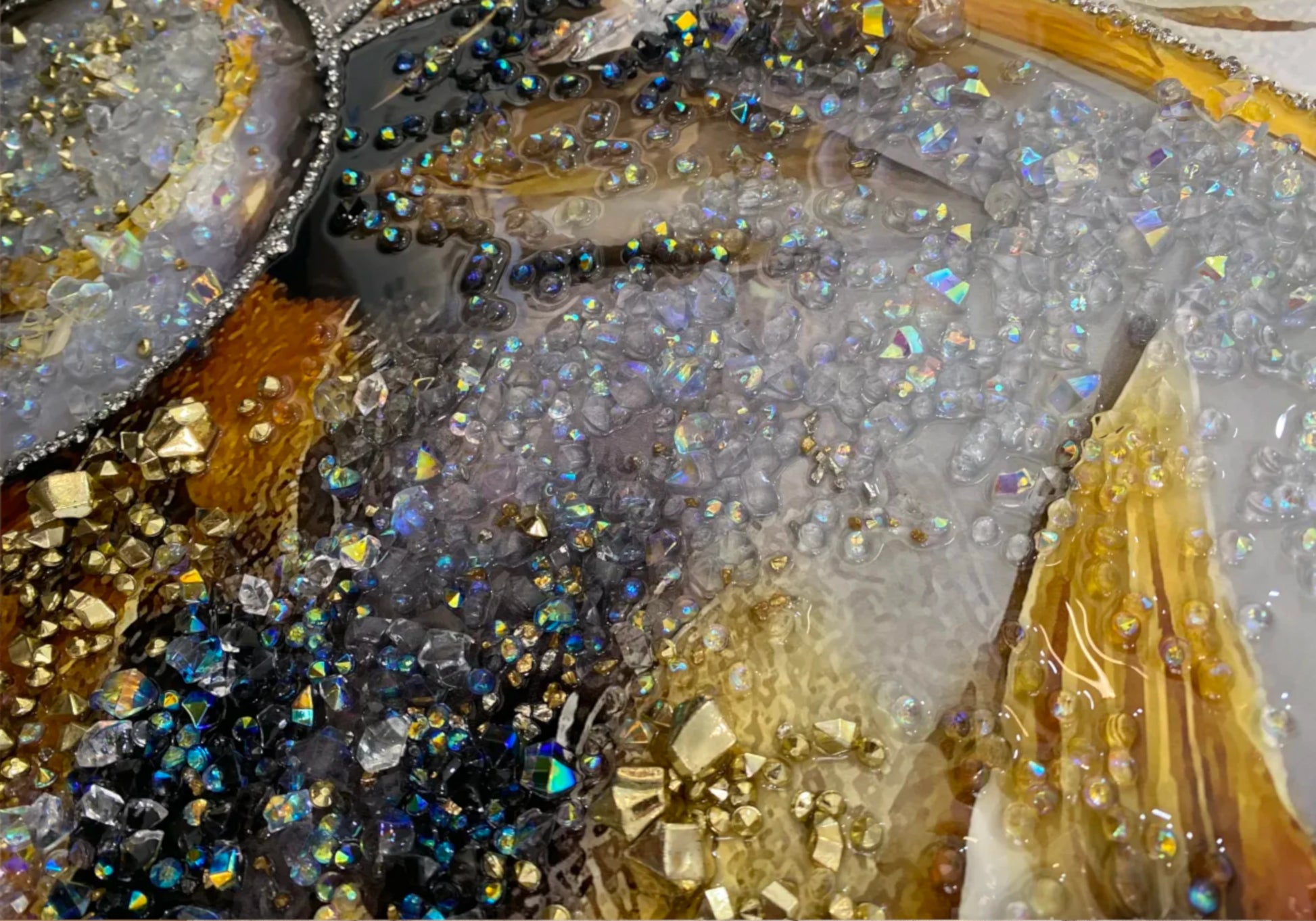 Le tableau FLORIA se démarque par son brillant exceptionnel. Grâce à la superposition de résine, paillettes et gemmes synthétiques, chaque zone du visuel capte la lumière avec élégance. Les contours des sphères en arrière-plan renforcent l’effet de profondeur.