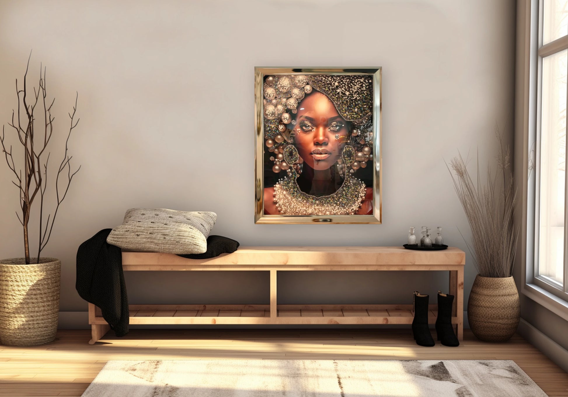 Afro chic, portrait précieux, décoration artistique luxe.