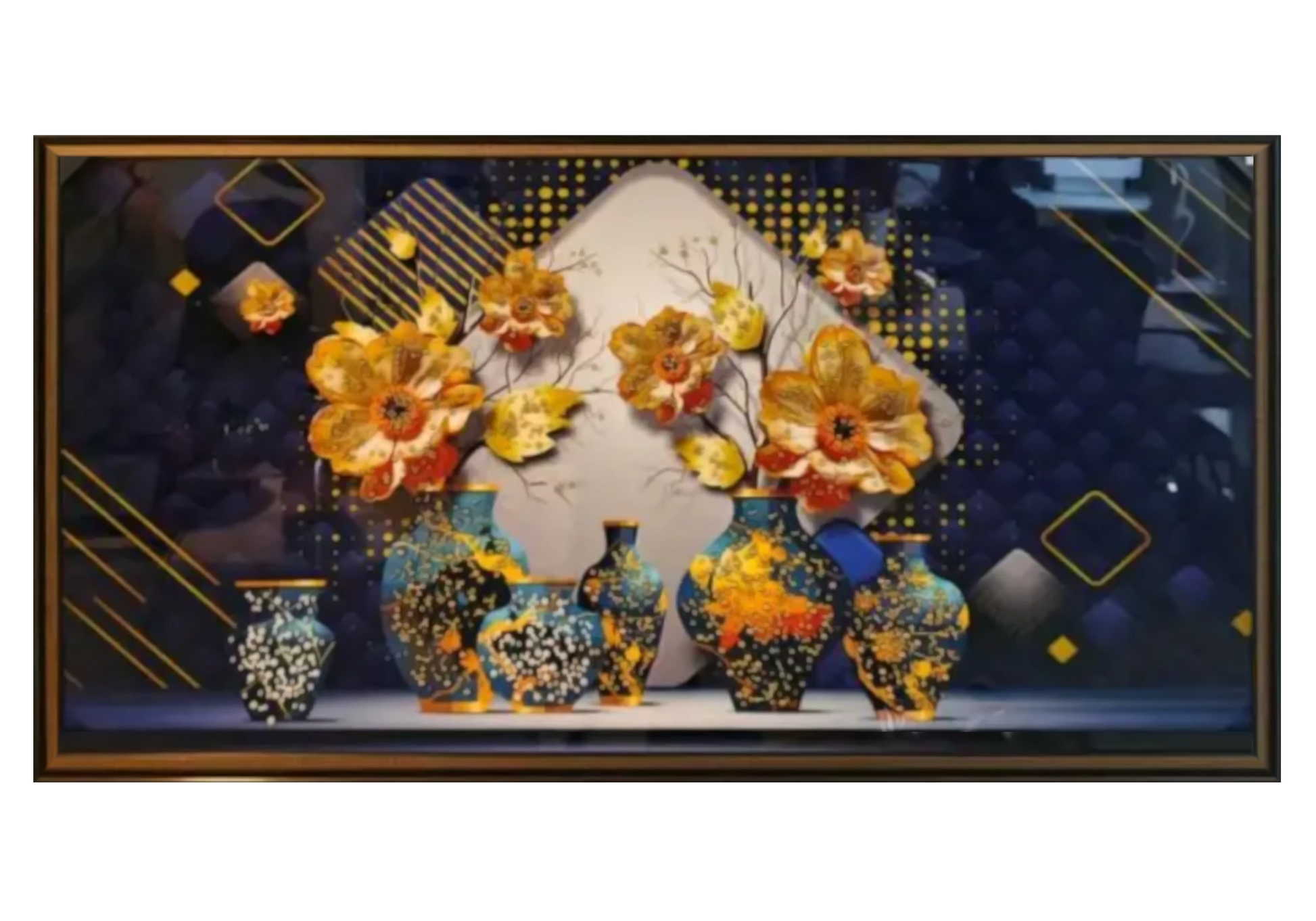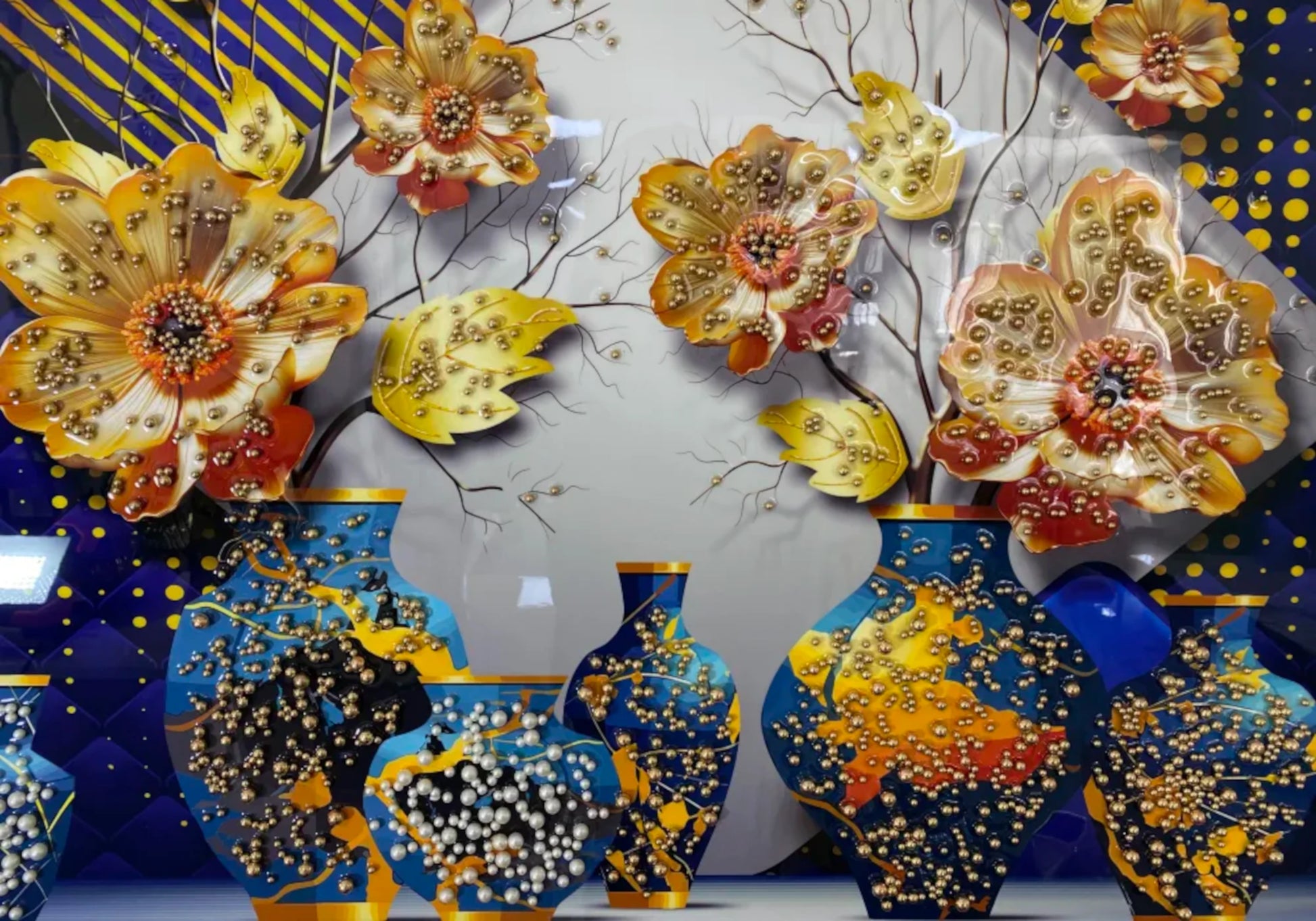 Le tableau mural VELORA met en scène une envolée de fleurs dorées et orangées, texturées de perles scintillantes qui évoquent la richesse et la minutie d’un travail artisanal. Chaque pétale, chaque tige est mis en valeur par un jeu de volumes saisissant, offrant un effet 3D bluffant.