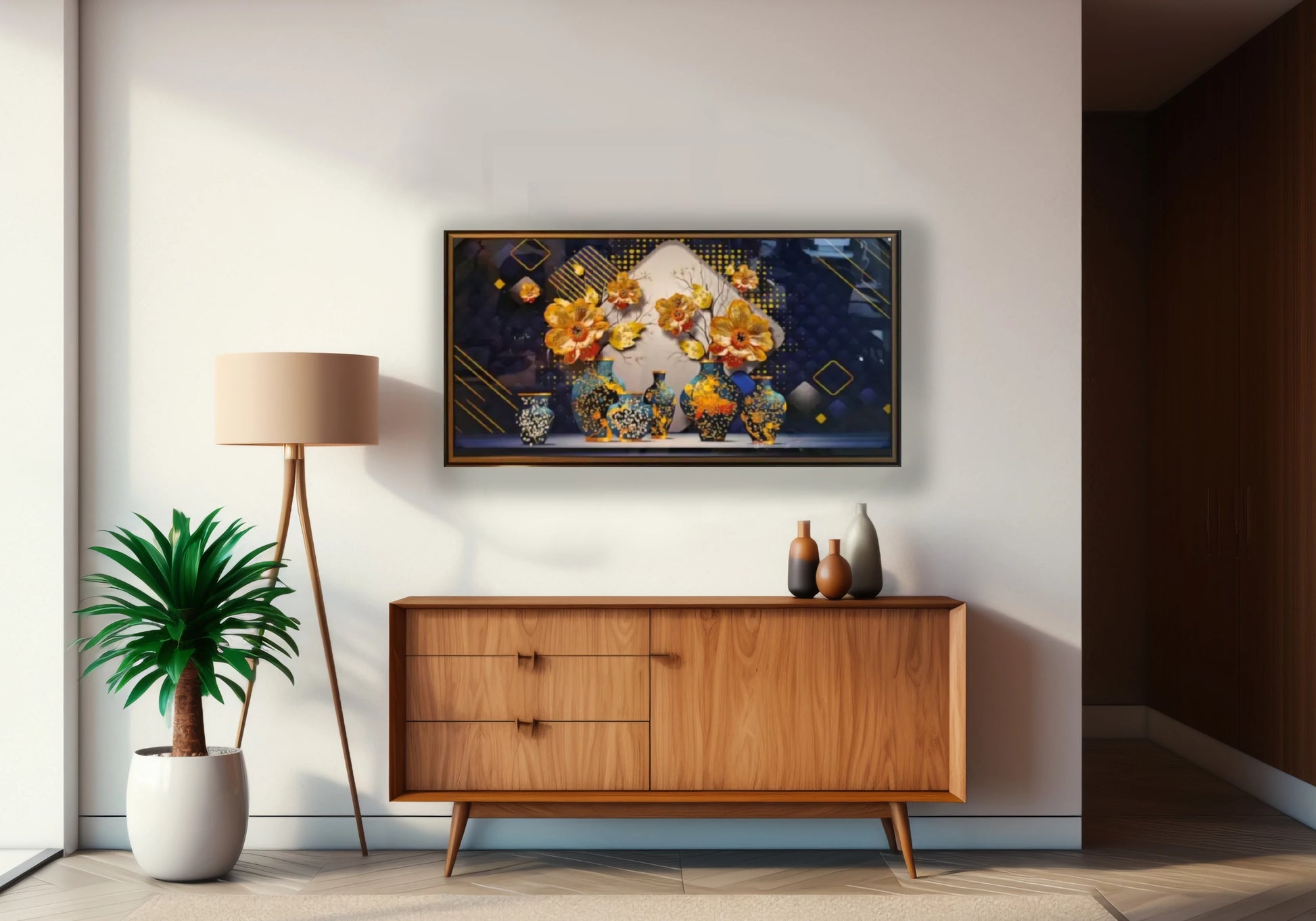Le fond, parsemé de losanges jaunes et de lignes obliques, contraste subtilement avec les vases bleus décorés. Ces derniers captent la lumière et soulignent la profondeur de la composition. Le résultat est un tableau vivant, presque animé, parfait pour illuminer vos murs.