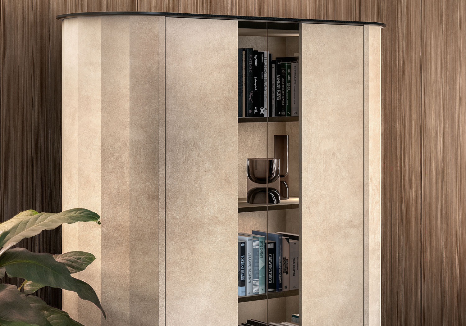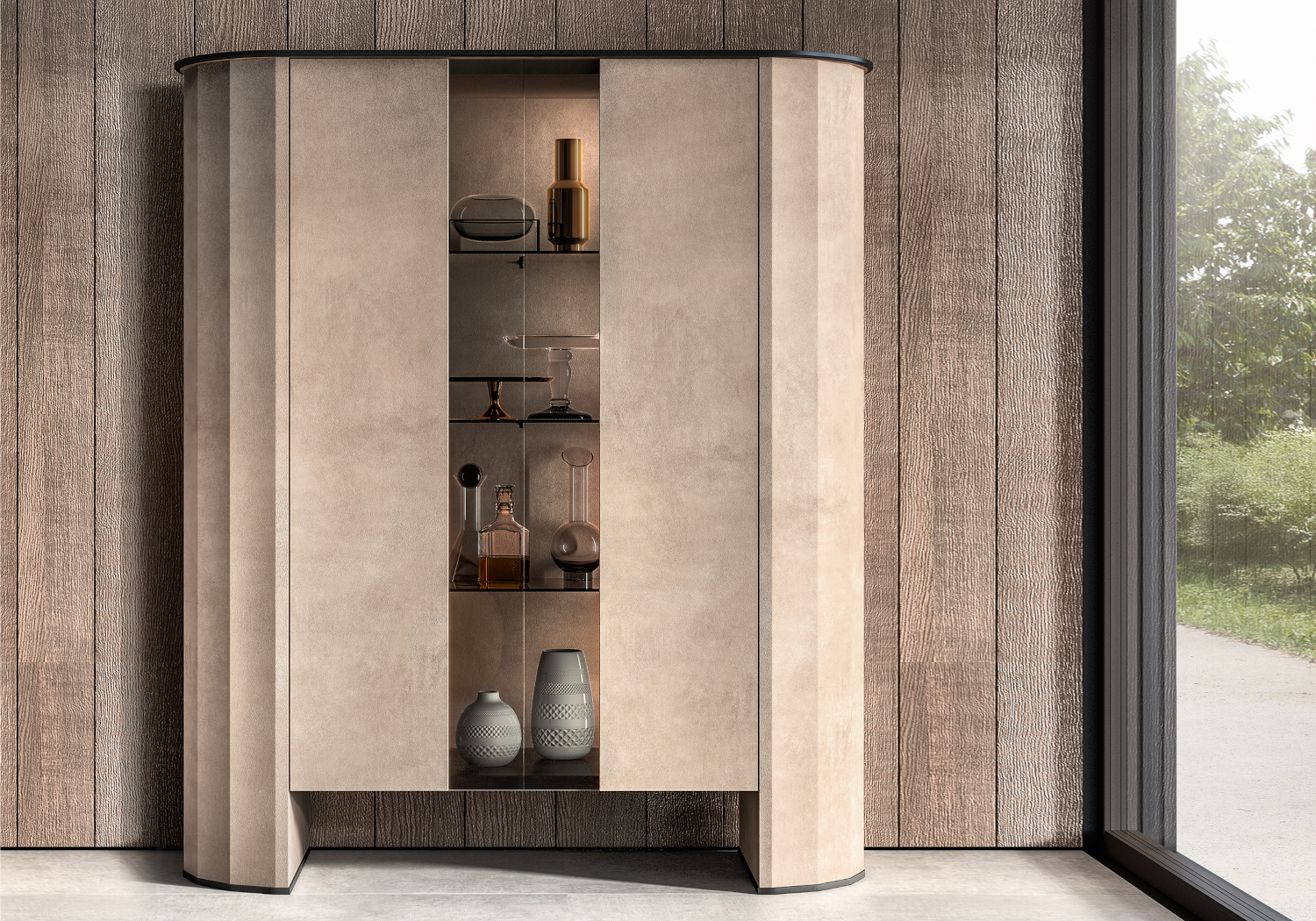 Véritable pièce d’architecture intérieure, la vitrine Dune affirme une présence raffinée. Son effet pierre et son design italien contemporain structurent l’espace avec subtilité et donnent du relief à l’aménagement.